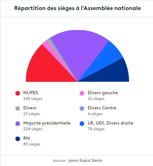 Selon les premières estimations IPSOS SOPRA-STERIA, il n'y a pas de majorité absolue pour la coalition présidentielle Ensemble ! qui obtient 224 sièges (38,82% des votes). La NUPES compte 149 sièges (25,82% de suffrages). De son côté, le Rassemblement National fait une percée historique avec 89 sièges à l'Assemblée nationale (15,42% des voix).