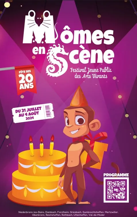 Ne manquez pas le festival “Mômes en scènes”, 26 spectacles pour le jeune public du 31 juillet au 4 août à Niederbronn-les-Bains et dans ses communes voisines. "Mômes en scène" fête cette année ses 20 ans avec une journée anniversaire le vendredi 2 août.