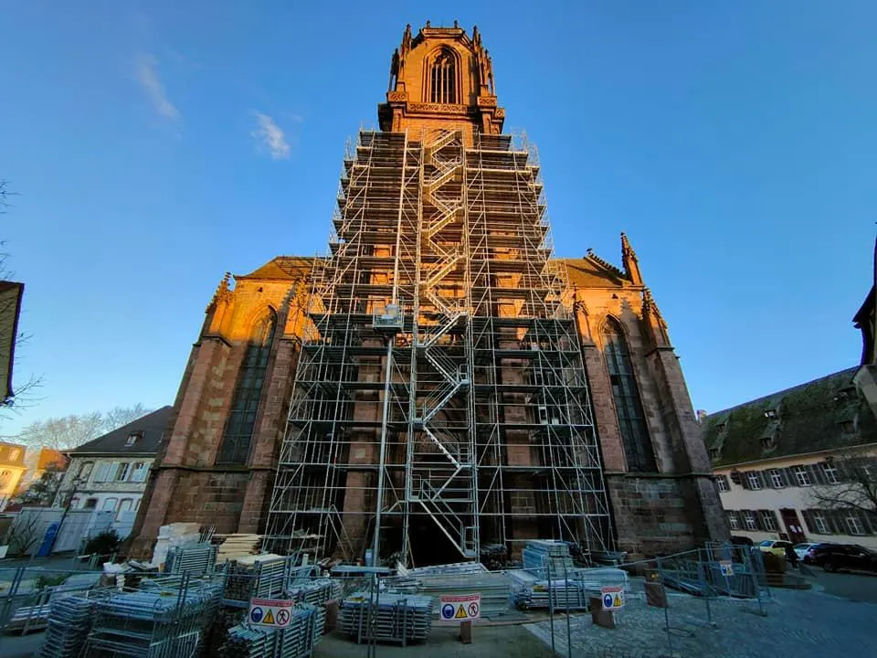 Les Sélestadiens observent depuis quelques semaines le montage de l’échafaudage à l’église Saint-Georges. Ce chantier interpelle forcément car situé au coeur de la ville et sur un édifice emblématique de la cité humaniste. L’église Saint-Georges (classée Monument historique depuis 1848) se refait une beauté et cela va durer cinq ans ! Quatre tranches de travaux vont se succéder pour un coût total de 8,6 millions d’euros (dont un million d’euros que pour les échafaudages). Pour la première tranche - la plus importante - avec la rénovation de « la flèche », la tour du massif occidental, un échafaudage de 70 mètres de hauteur est entrain d’être installé. Il faudra trois mois pour le monter. Les travaux débuteront concrètement le 11 avril 2022. De nombreux corps de métiers interviendront : maçonnerie, pierre de taille, sculpture, traitement de la pierre, charpente, menuiserie, couverture (tuiles et ouvrages métalliques) et l’épiderme colorée de l’édifice sera aussi traitée (entre granite et grès des Vosges) avec l’intervention de restaurateurs de peinture murale.
