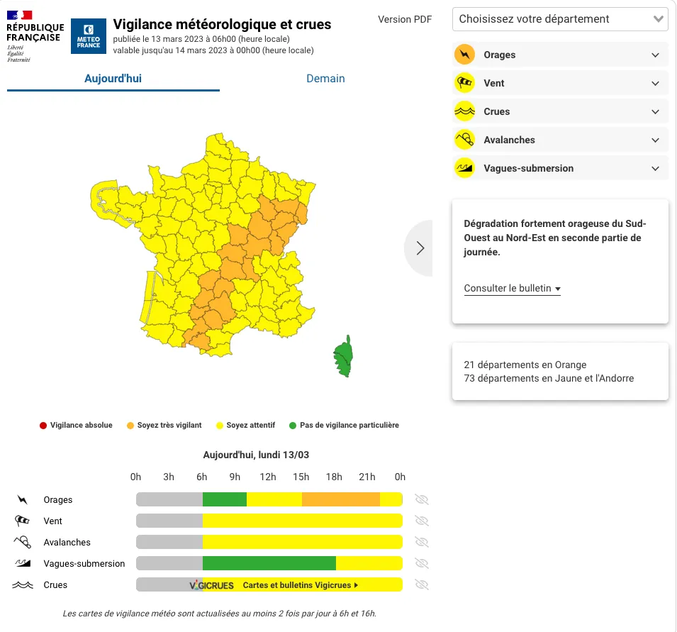 Article actualisé à 13h : le Bas-Rhin est désormais aussi placé en vigilance orange aux orages. Le risque orageux débutera vers 16h jusqu'en début de nuit. La Ville de Strasbourg a décidé de fermer ce lundi 13 mars à partir de 17h, les six parcs suivants : Pourtalès, Orangerie, Contades, Citadelle, Schulmeister et Albert Schweitzer. Les neuf cimetières municipaux de Strasbourg seront également fermés.