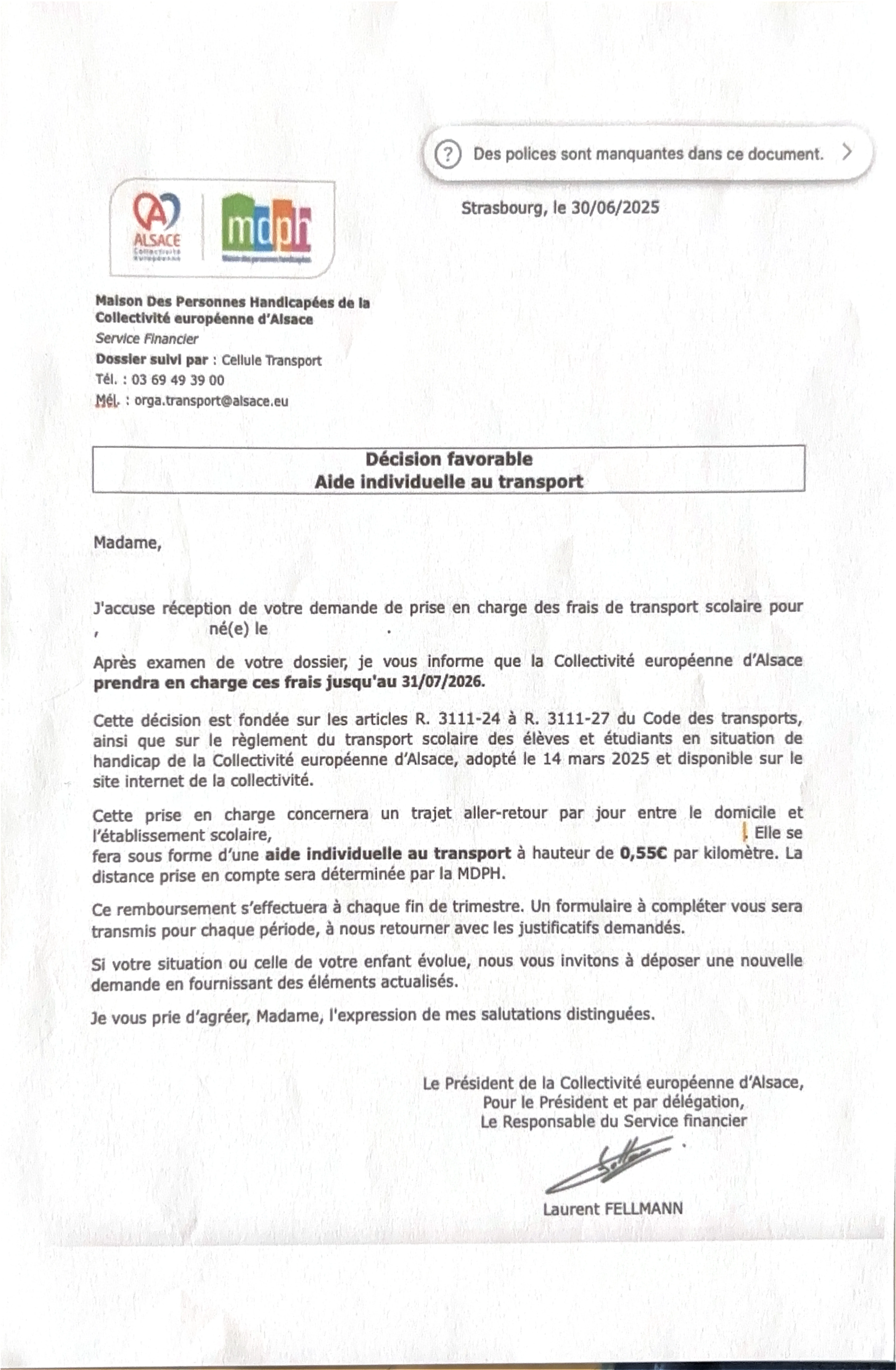 Comme chaque année, Raymond Roessinger a formulé une demande de transport adapté auprès de la CEA et de la Maison départementale pour les personnes handicapées (MDPH) pour son fils de 11 ans, en situation de handicap. Début septembre, il a reçu un courrier sur lequel il est indiqué en gras ‘’Décision favorable’’. Jusqu’ici, rien ne change.