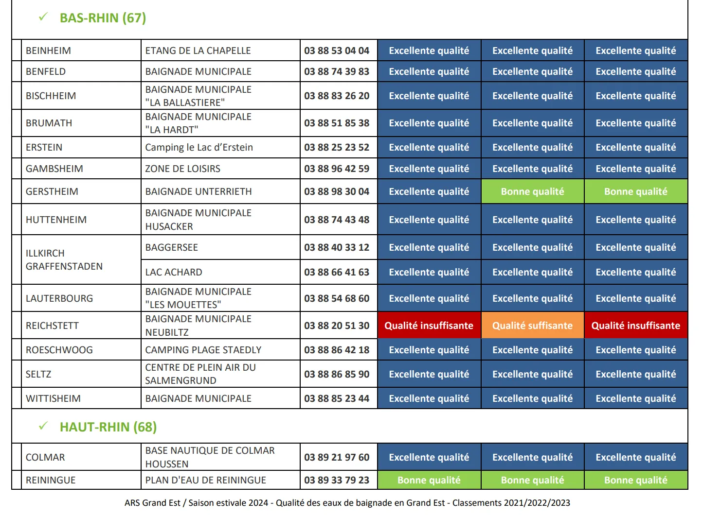 L'ARS recense 16 sites de baignades réglementés en Alsace, 14 dans le Bas-Rhin, et 2 dans le Haut-Rhin. Globalement, comme on peut le voir sur le tableau ci-dessous, les eaux sont d'excellente qualité à l'exception de Reichstett, qui ne parvient pas à améliorer la situation, malgré un environnement tout à fait exceptionnel, entre plage de sable, terrains de beach-volley, de pétanque, et arbres pour se mettre à l'ombre. Gerstheim et Reiningue affichent une eau de "bonne qualité", qui reste tout à fait acceptable. Pour le reste, on peut plonger tête la première sans aucun risque !