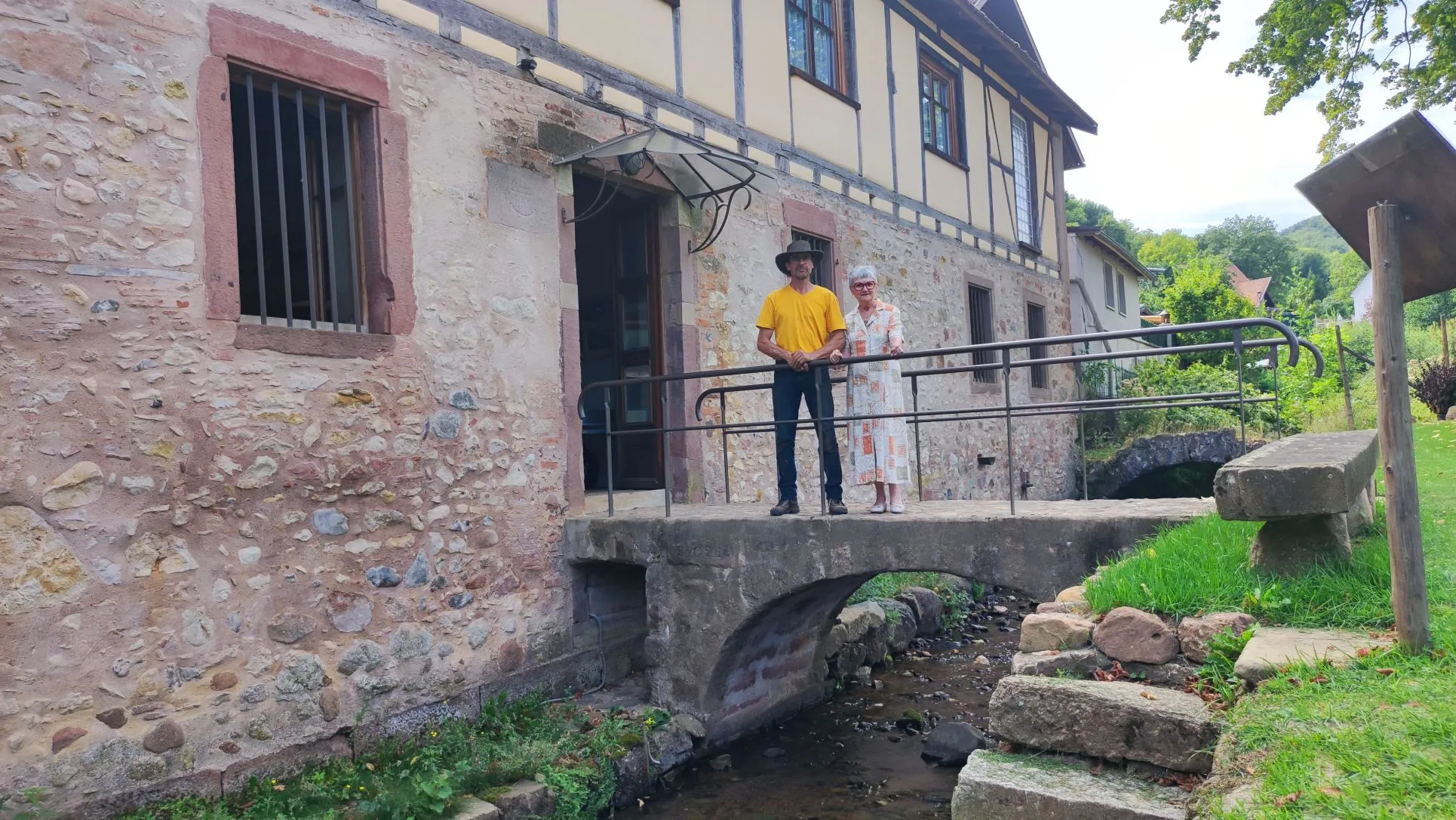 Quand Clémentine vous accueille avec son grand sourire et ses yeux malicieux, c'est pour mieux vous raconter tout le travail réalisé ici depuis 2003. "C'est une bâtisse qui était habitée un peu comme un loft, avec une seule porte, pas d'ouverture. On a voulu l'ouvrir sur l'extérieur, tout en gardant certains éléments comme une partie du mur d'origine ou des poutres de 22 mètres de long d'un seul tenant. C'est incroyable ce qu'ils pouvaient faire à l'époque." L'époque, c'est 1750, plus ancienne date dénichée dans les archives, même s'il est probable qu'un autre moulin ou bâtiment ait servi avant cela. Du moulin, sa roue, et de la configuration d'origine, il ne reste pas grand chose. Clémentine et son mari Bernard ont conservé un accès au petit cours d'eau, la Kirneck, un affluent de l'Andlau, dont l'eau sans calcaire a fait les belles heures des tanneurs du 18e siècle. "C'était d'abord un moulin à farine", précise Clémentine, qui n'a rien perdu de son ton dictatique d'ancienne enseignante. "Il a ensuite été converti en moulin de bois de teinture de 1810 à 1848. On faisait venir un bois du Mexique pour faire de la couleur." Un artisanat aujourd'hui disparu, même si les tanneries Haas, pas très loin, restent un dernier témoin de cette ère.