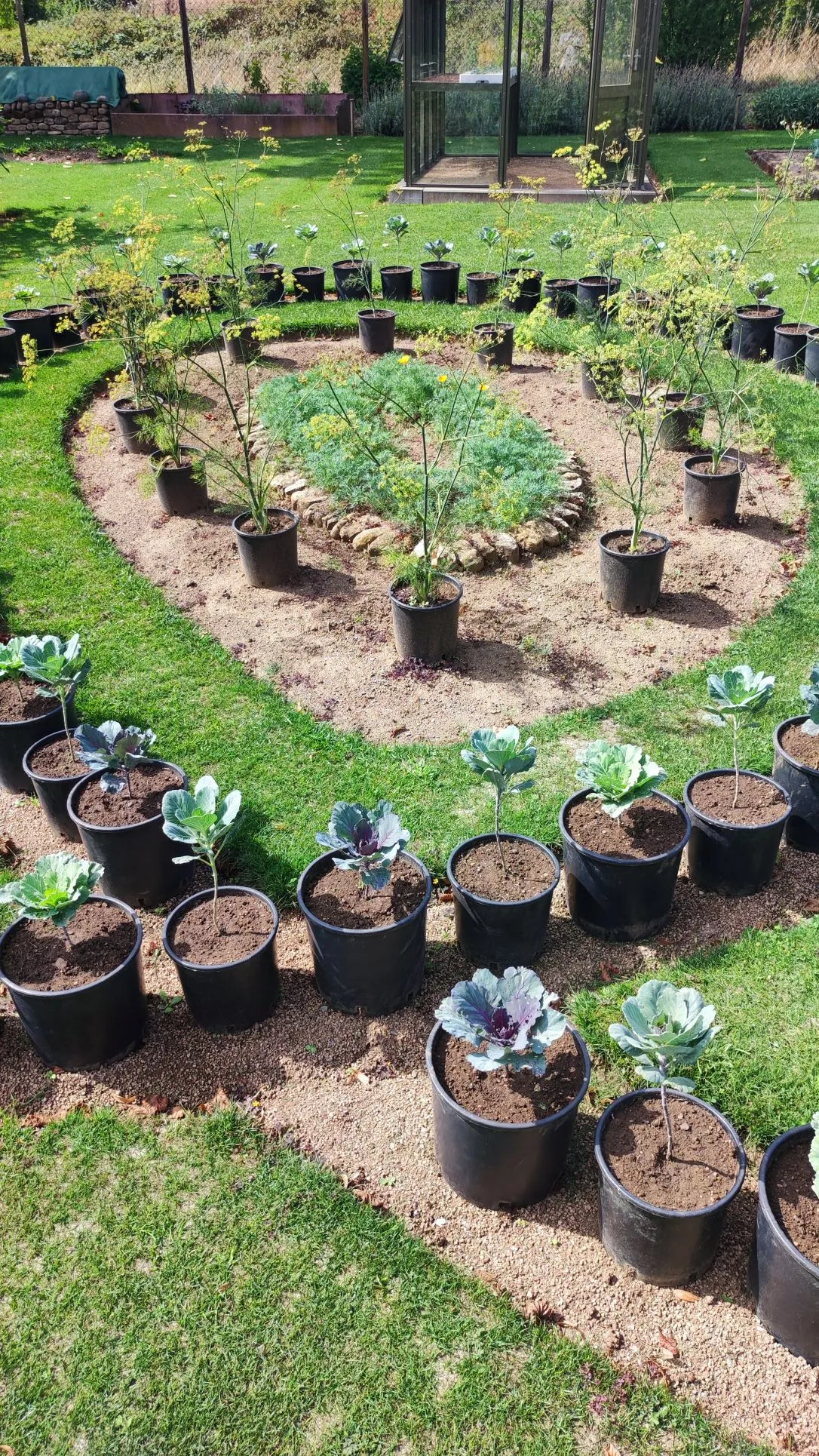 Bernard, ancien imprimeur, n'était pas spécialement bricoleur. C'est pourtant lui qui a entrepris de construire un petit pont, avec les méthodes d'antan, pour respecter le lieu et son histoire. Il permet d'enjamber le ruisseau et d'accéder à son jardin à la Française, aux multiples cultures. La pelouse est impeccable, l'irrigation intelligente, et selon les saisons on y trouvera tomates, pommes de terre, choux, framboises, pastèques, melons, mûres, mirabelles, figues, haricots, échalottes, poireaux, navets (etc. x10). Tout est pensé, et Bernard aime distiller de précieux conseils aux visiteurs : "C'est intéressant de mettre de la lavande pour attirer les insectes pollénisateurs." Avec son potager qui lui permet d'être auto-suffisant, il s'amuse à tester et récolter ses propres graines - qu'il offre parfois aux plus passionnés. Mais si le potager occupe aujourd'hui le plus clair de son temps, il n'oublie pas quelques chiffres : "On a quand même amené 600 tonnes de pierres sèches à l'avant et 400 tonnes à l'arrière. Pour la construction du pont, on a fait venir 150 blocs de grés ! Et là, devant vous, j'ai 250m² de potager, avec un décor qui change trois fois par an. Parfois des dahlias, des coquelicots. Pour cet automne, j'ai mis 335 choux décoratifs."