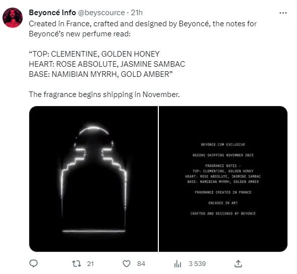 Beyoncé, en pleine tournée mondiale avec Renaissance World Tour, vient d'annoncer la sortie prochaine de son nouveau parfum, "Eau De Parfum".