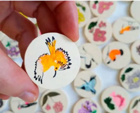 - Marion Hamaide, broche en bois dessinées à la mains (fleurs et oiseaux) : 12 €