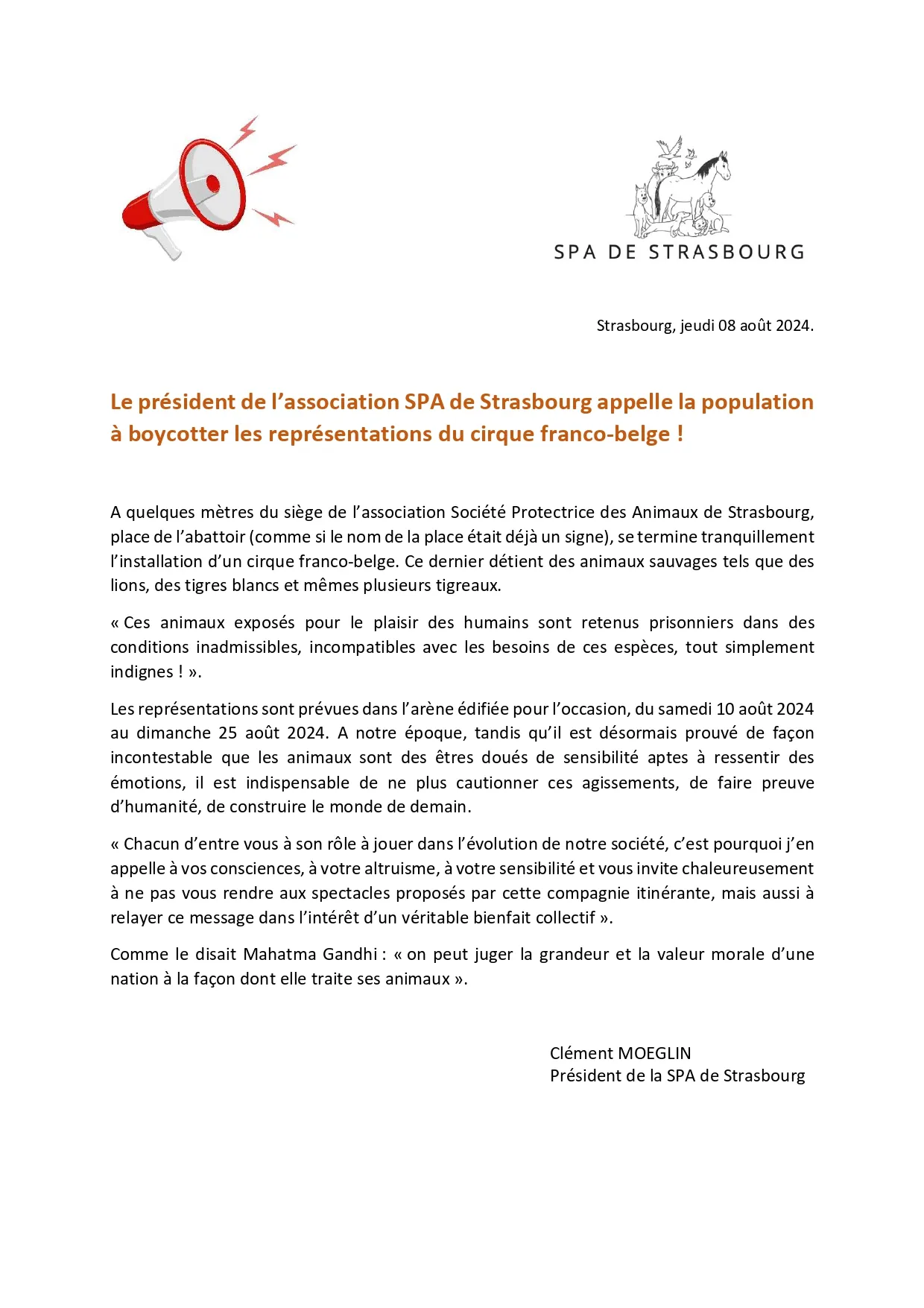 La SPA de Strasbourg est également montée au créneau. Par voie de communiqué, son président Clément Moeglin, appelle au boycott des spectacles. « Ces animaux exposés pour le plaisir des humains sont retenus prisonniers dans des conditions inadmissibles, incompatibles avec les besoins de ces espèces, tout simplement indignes ! », écrit-il. Serge Muller est allé faire un tour du côté de la SPA de Strasbourg située à seulement quelques mètres du cirque itinérant, il renvoie la balle en dénonçant à son tour les conditions de détention des animaux au sein de l’association. « Je suis allé les voir parce qu’on était en "bisbille" avec eux. Là-bas, les chiens ont trois m² d’espace et sont en plein soleil. Nous, nous avons des tentes et on applique la loi. Nos animaux sont bien traités et ne sont pas malheureux. », raconte le gérant qui invite les gens à venir visiter gratuitement la ménagerie contenant une cinquantaine d’animaux afin de se faire son propre avis.