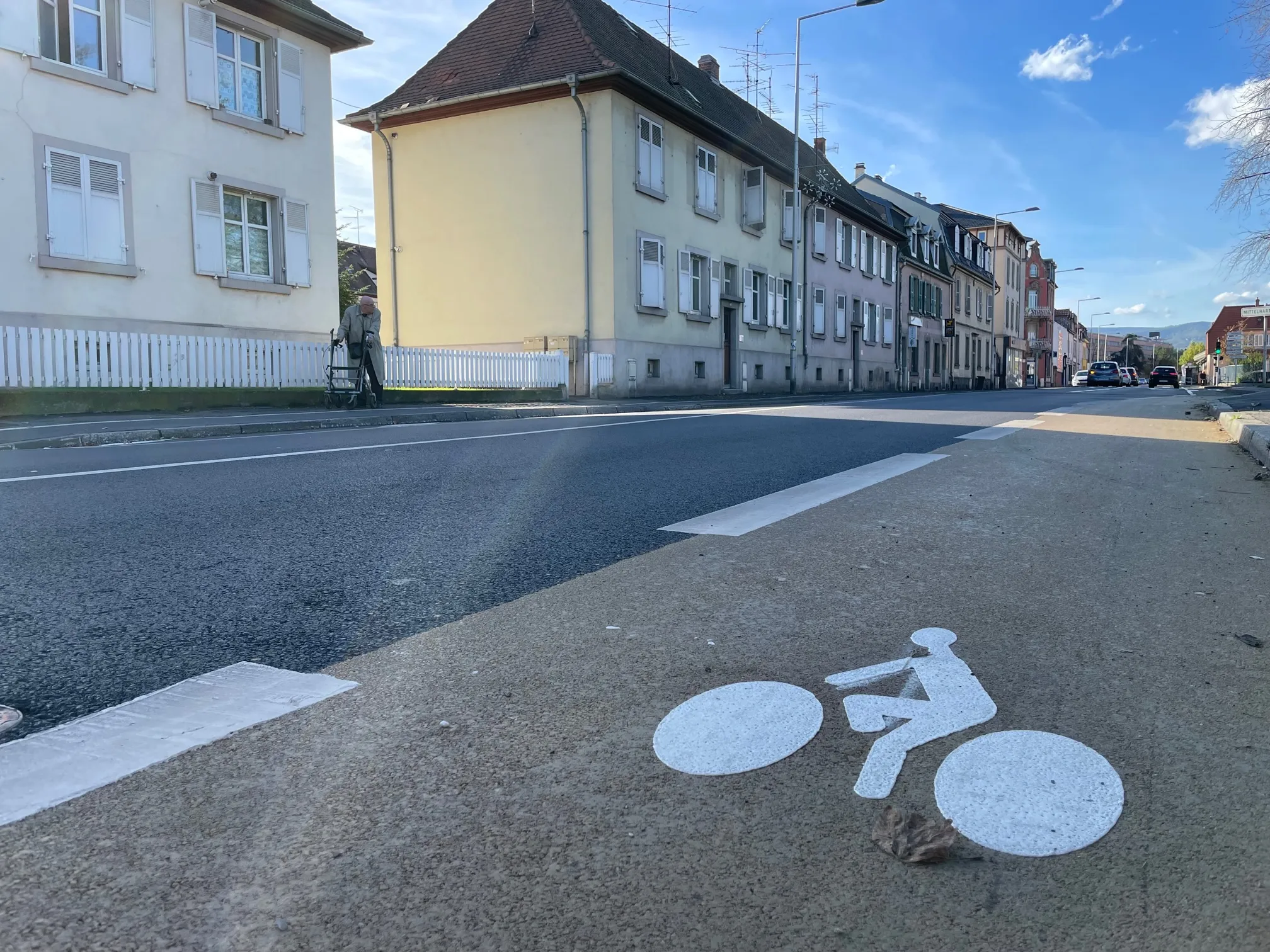 Après il y a toujours des points noirs et selon les circuits qu’on fait ou les parcours qu’on fait, il y a des endroits qui sont plus compliqués que d’autres. Ici (route d’Ingersheim) c’était un point noir clairement. Il y avait conflit d’usage entre les piétons et les cyclistes sur le trottoir, avec un rebord de trottoir assez important et on était en insécurité quand on était à vélo sur le trottoir, on avait peur de tomber sur la rue. Il y a eu des accidents. Il y a des bus qui passent. Donc là maintenant il y a un réel mieux, ça s’est clair. On a donc supprimé la bande cyclable sur le trottoir, on l’a mise sur la voirie, on a réduit un petit peu la voirie. Il n’y a plus que deux voies pour les automobiles, avec 1,50m de bande cyclable de chaque côté.