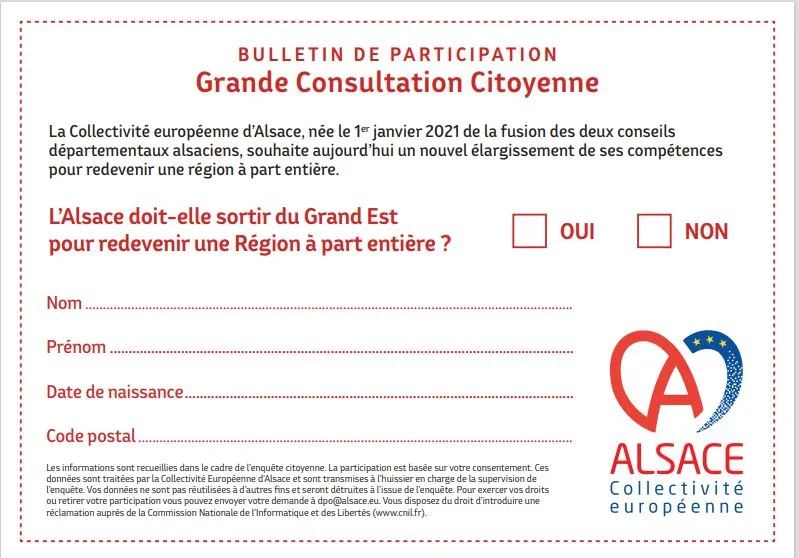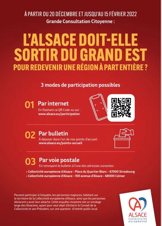 Cette consultation s’adresse à toutes les personnes majeures, résidant en Alsace. Vous pouvez donner votre avis jusqu’au 15 février 2022 en ligne, par voie postale en renvoyant le bulletin à la Collectivité européenne d’Alsace à Colmar ou Strasbourg, ou en déposant le bulletin dans les points d’accueil.