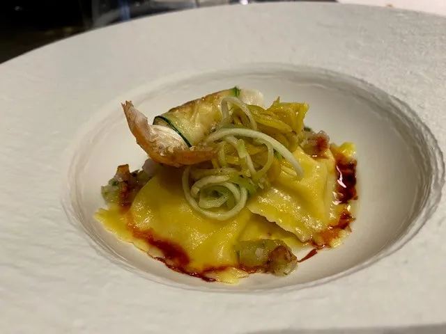 Ravioles de langoustines, spaghettis de courgettes, vinaigrette de betterave rouge et basilic frais