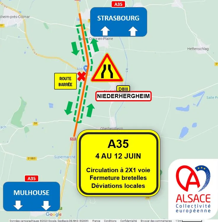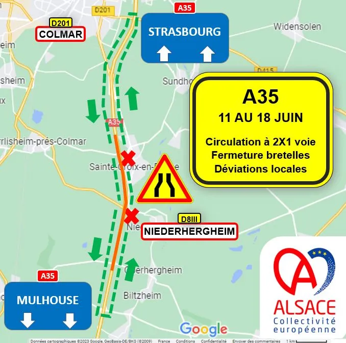 L’échangeur de Niederhergheim (N°28) sera très impacté : l’entrée et la sortie A35 du sens Colmar vers Mulhouse seront fermées du dimanche 4 juin à 20 h au lundi 12 juin à 6 h. Il en sera de même dans le sens inverse, du dimanche 11 juin à 20h jusqu’au dimanche 18 juin à minuit. L’échangeur N°27 (Sainte-Croix-en-Plaine) sera lui aussi fermé du 11 au 18 juin dans le sens Mulhouse vers Colmar. Quant à l’aire de repos « La plaine », elle ne sera pas accessible du 9 au 18 juin. Pour ces travaux, le budget est de 1,5 millions d’euros, pris en charge par la Collectivité européenne d’Alsace.