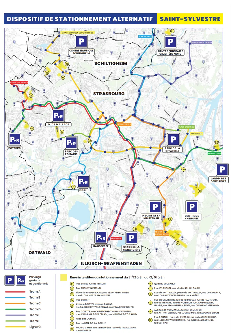 L’Eurométropole de Strasbourg renouvelle son dispositif de stationnement et de circulation pour la Saint-Sylvestre. Afin de limiter les risques liés aux incendies de véhicules et pour faciliter l’accès aux services de secours, des rues seront interdites à la circulation le soir du 31 décembre. Des parkings gratuits et surveillés seront mis à disposition des habitants. Accessibles à partir de 6h du matin le 31 décembre jusqu’au 1er janvier 2024 à 15h, seize parkings gratuits seront ouverts dans les communes de Strasbourg, Bischheim, Hoenheim, Schiltigheim, Illkirch-Graffenstaden, Lingolsheim et Ostwald. En 2022, cette initiative avait permis à 1200 véhicules de stationner gratuitement et en toute sécurité pendant les festivités du Nouvel An. L'Eurométropole de Strasbourg recommande à ses habitants de faire preuve de vigilance et de garer leurs véhicules en dehors des zones interdites à la circulation.