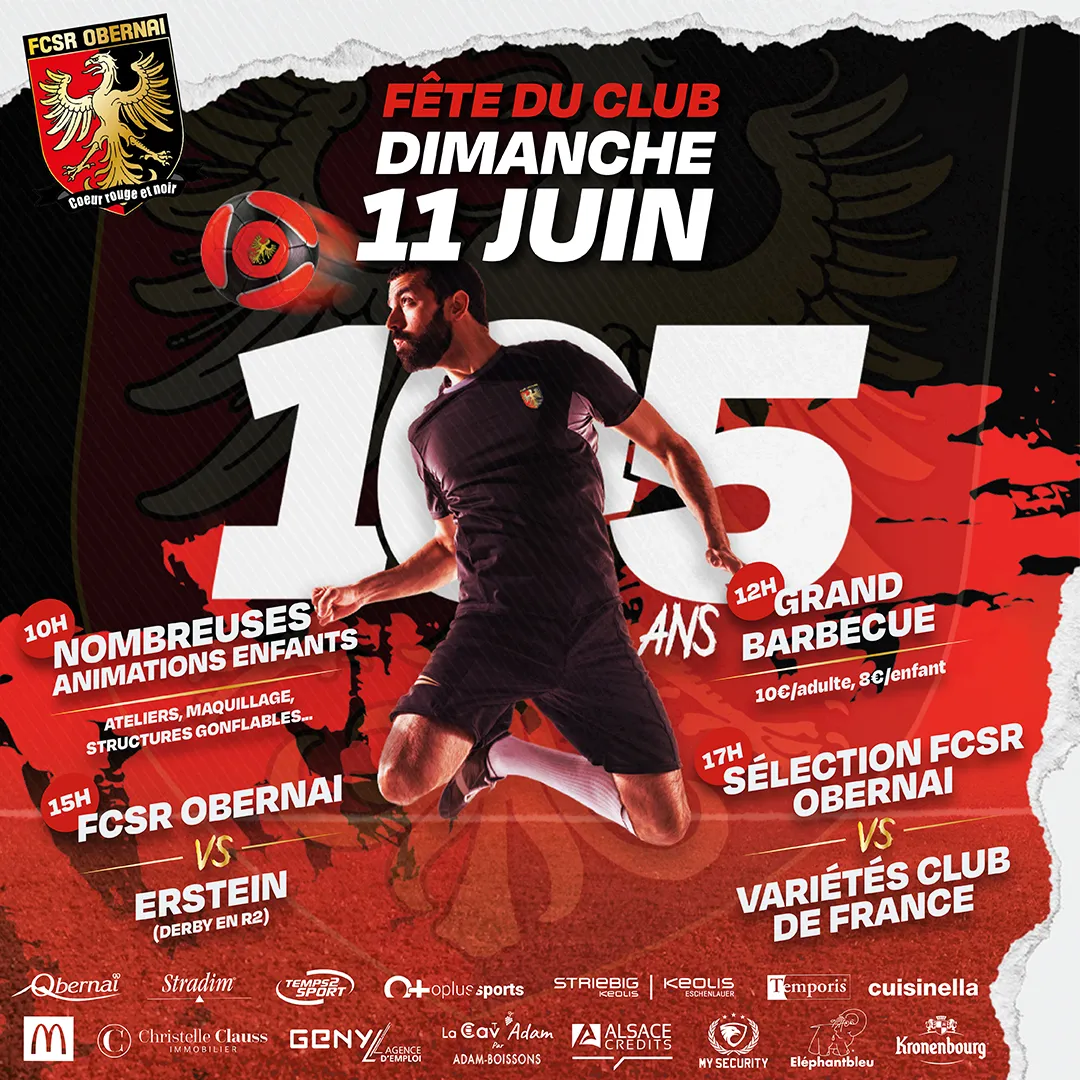 Le FCSR Obernai fête ses 105 ans le dimanche 11 juin prochain au stade municipal. Pour l'occasion, le club organise une grande journée festive avec de nombreuses animations, notamment pour les enfants en matinée, avant de passer à un barbecue géant. On retrouvera par exemple une grande structure gonflable, un car podium de magie, un challenge de la bache, du tennis-ballon, une rencontre franco-allemande ainsi qu'une grande tombola.