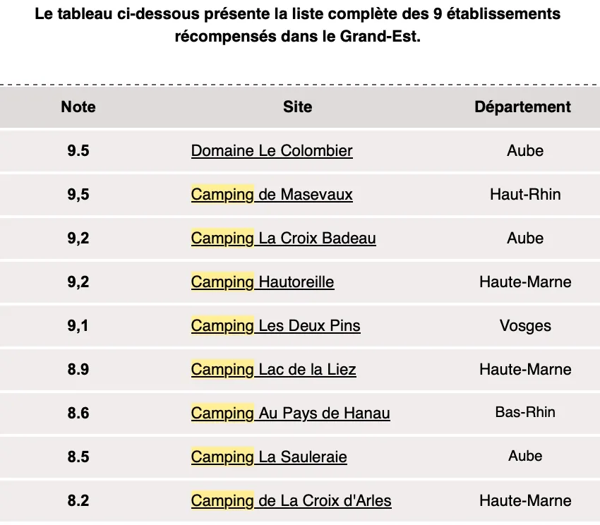 « Basée sur plus 9 144 avis clients collectés en 2023, cette évaluation se fonde sur des critères définis tels que l'emplacement, le rapport qualité-prix, la qualité de l'hébergement, les activités et la propreté de chaque site. Pour faire partie de cette sélection, les établissements doivent avoir récoltés un minimum de 20 avis et sont ensuite notés sur dix », explique pitchup.com, la plateforme leader de réservation d’hébergement en plein air en Europe. C’est elle qui a réalisé ce classement. « 114 sites d’hôtellerie de plein air en France obtiennent une note globale égale ou supérieure à 8/10. Parmi eux, pas moins de 9 se situent dans le Grand-est ». En Alsace, nous avons deux campings récompensés : le camping de Masevaux dans le Haut-Rhin (avec une note de 9,5/10 et qui arrive donc 2ème au classement) et le camping Au Pays de Hanau dans le Bas-Rhin (avec une note de 8,6/10). A noter que dans le Grand Est le camping qui à la première place du podium est le Domaine du Colombier dans l’Aube.