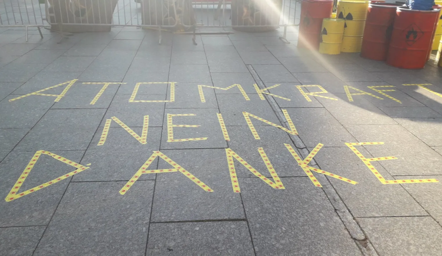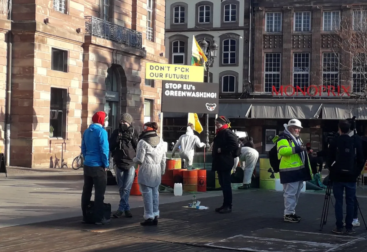 À l'occasion de la venue d'Emmanuel Macron à #Strasbourg, des militants anti-nucléaires ont manifesté ce matin place Kléber. @StopFessenheim pic.twitter.com/o4u5KeO0EA
