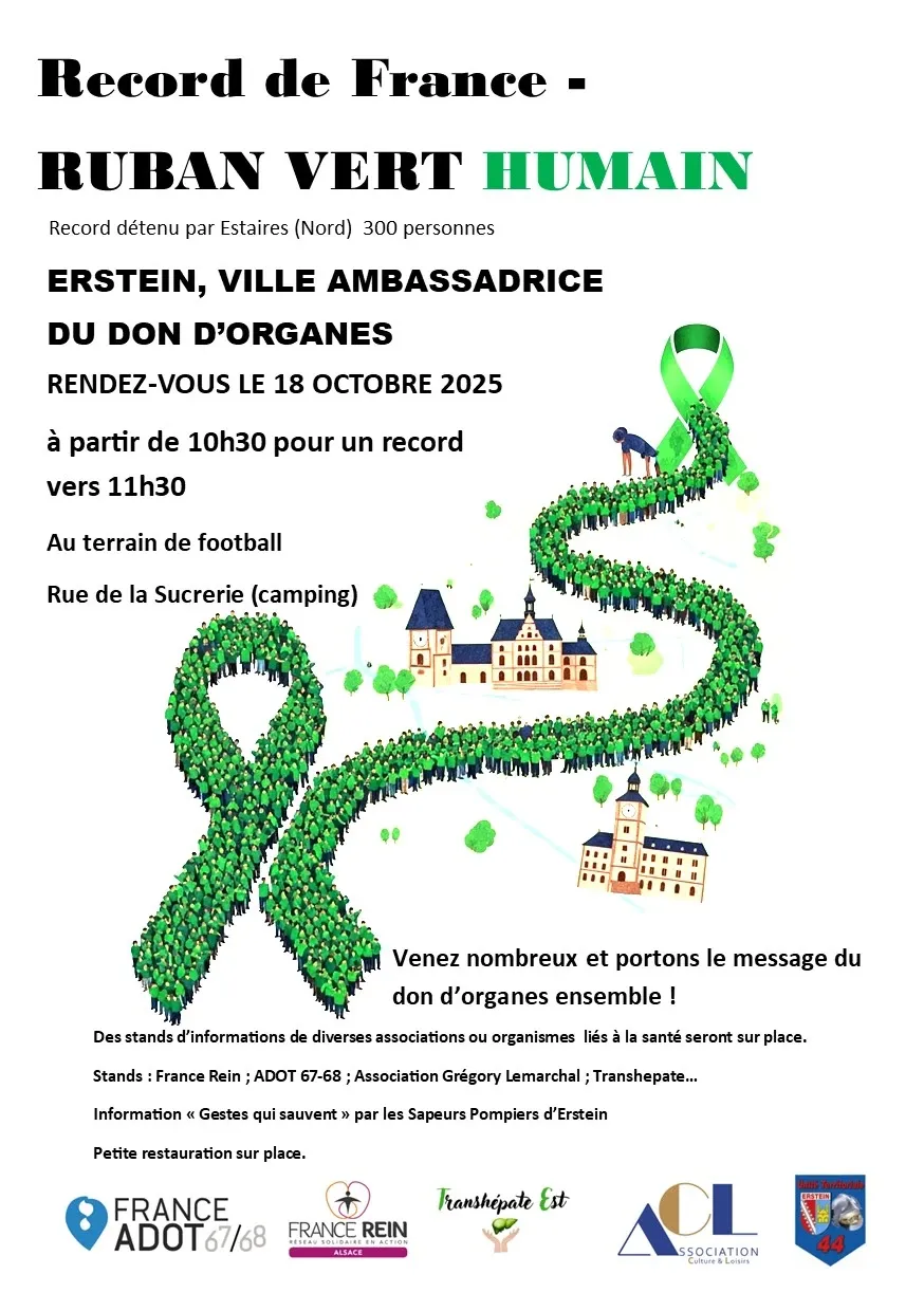 Un record de France va tenter d’être battu ce samedi 18 octobre à Erstein : le plus grand ruban vert humain, pour symboliser le don d’organes. Il faudra mobiliser plus de 300 personnes pour battre le précédent record détenu par une ville du nord de la France.