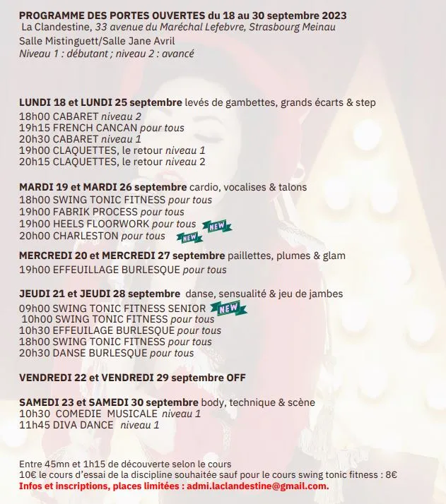 Si vous aussi vous avez envie d'essayer le French Cancan ou d'autres danses, voici le programme qui vous attend à La Clandestine pour les portes ouvertes du mois de septembre. Il y a aussi des claquettes, du cabaret ou encore du charleston.