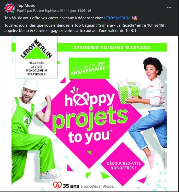 Pour célébrer les 35 ans de l'implantation de l'enseigne Leroy Merlin en Alsace, une opération anniversaire se déroule du 3 juin au 18 juin sur les quatre magasins du bassin strasbourgeois (La Vigie - Mundolsheim - Strasbourg - Haguenau). Chaque jour, vous pouvez gagner des cartes cadeaux de 100 euros en écoutant Top Music (voir image ci-dessous) :