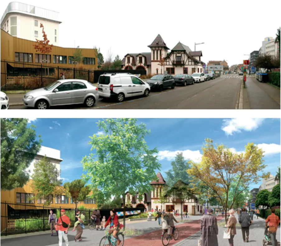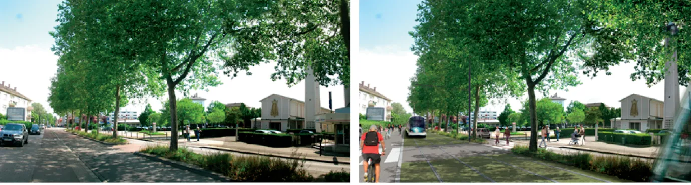 Avenue des Vosges : Le tramway permettrait de dépolluer le secteur qui est un des axes les plus empruntés de la ville. Les rames circuleront sur une plateforme centrale partagée entre les tramways et les voitures. De chaque côté des espaces végétalisés permettront d'apporter de la verdure. Par ailleurs les pistes cyclables et les trottoirs pour les piétons seront élargis.