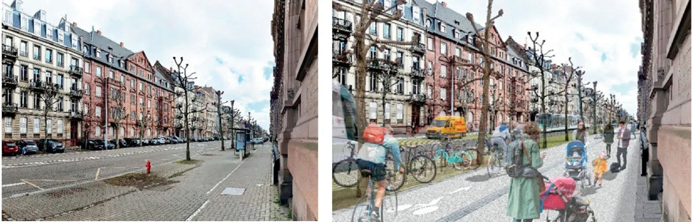Route de Bischwiller : En complément de l'insertion du tramway sur la route du Général de Gaulle, la partie sud de la route de Bischwiller sera piétonnisée entre la station de tramway « Fischer » et la rue Saint-Charles. Cet aménagement permet ainsi d'accorder une place significative aux modes actifs, de végétaliser ce linéaire aujourd'hui entièrement dédié à la voiture individuelle et d'étendre de manière considérable la centralité de Schiltigheim. Ainsi, la commune de Schiltigheim pourra profiter d'un centre apaisé, desservi par des moyens de transport performants.