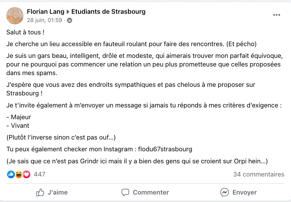 C’est grâce à une publication partagée sur le groupe Facebook « Etudiants de Strasbourg » qui compte pas moins de 83 000 membres, que Florian a décidé de se jeter dans le grand bain en espérant trouver son âme soeur. Un message tourné sur le ton de l’humour mais sur lequel il a eu plus de 5OO réactions et une cinquantaine de commentaires.