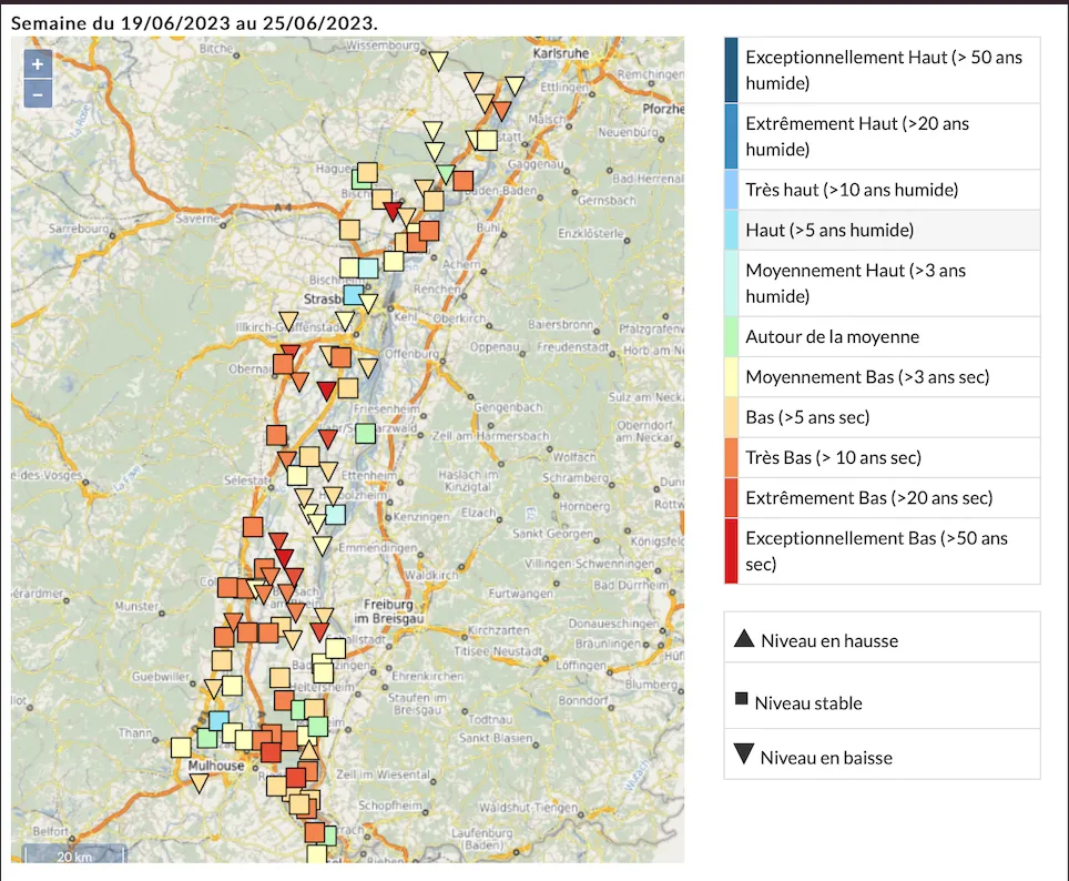 Ces zones sont bien connues et identifiées par les experts de l’Aprona. « Dès qu’on commence à se rapprocher des Vosges, la nappe est moins épaisse et varie plus au cours de l’année, comme dans le Sud de l’Alsace. Mais la zone la plus sensible c’est celle du Grand Ried qui sert parfois en été pour de l’irrigation. » Une zone particulièrement surveillée dont l’état a déjà suscité l’inquiétude. « Sur les cinq points de surveillance qu’on a au Grand Ried, quatre ont déjà atteint le seuil de vigilance », observe Victor Haumesser. Le secteur a été placé en vigilance par la préfecture du Bas-Rhin, le vendredi 23 juin.