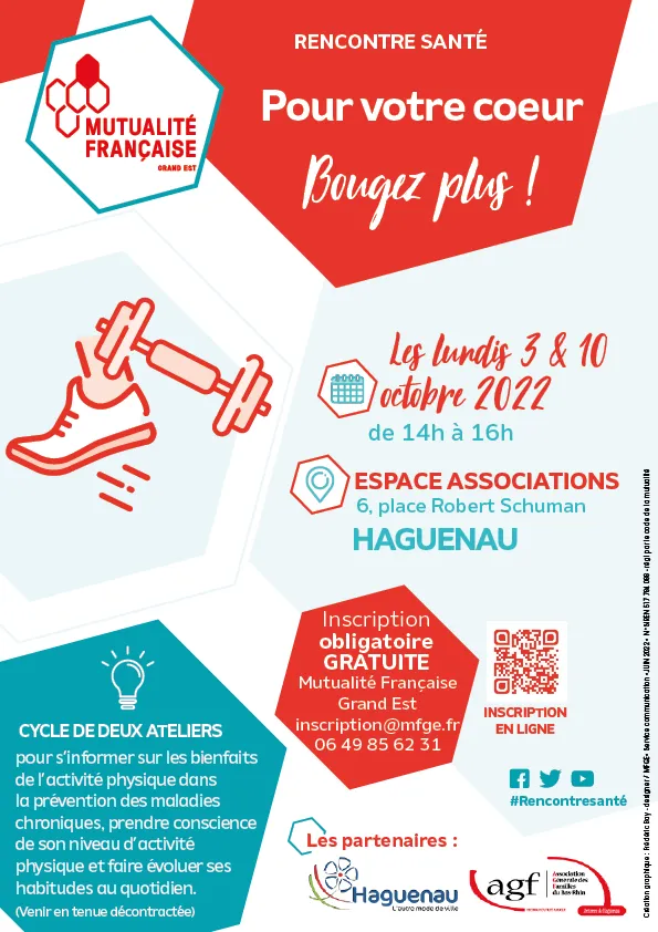 Il faut donc inciter plus que jamais à une prise de conscience. Les lundis 3 et 10 octobre, la Ville de Haguenau, l'Association générales des Familles du Bas-Rhin et la Mutualité Française Grand Est organisent des rencontres intitulées "Pour votre coeur, bougez plus !", ce qui est relativement clair. Deux après-midi pour comprendre tous les bienfaits que l'on retire de simplement bouger un peu plus.