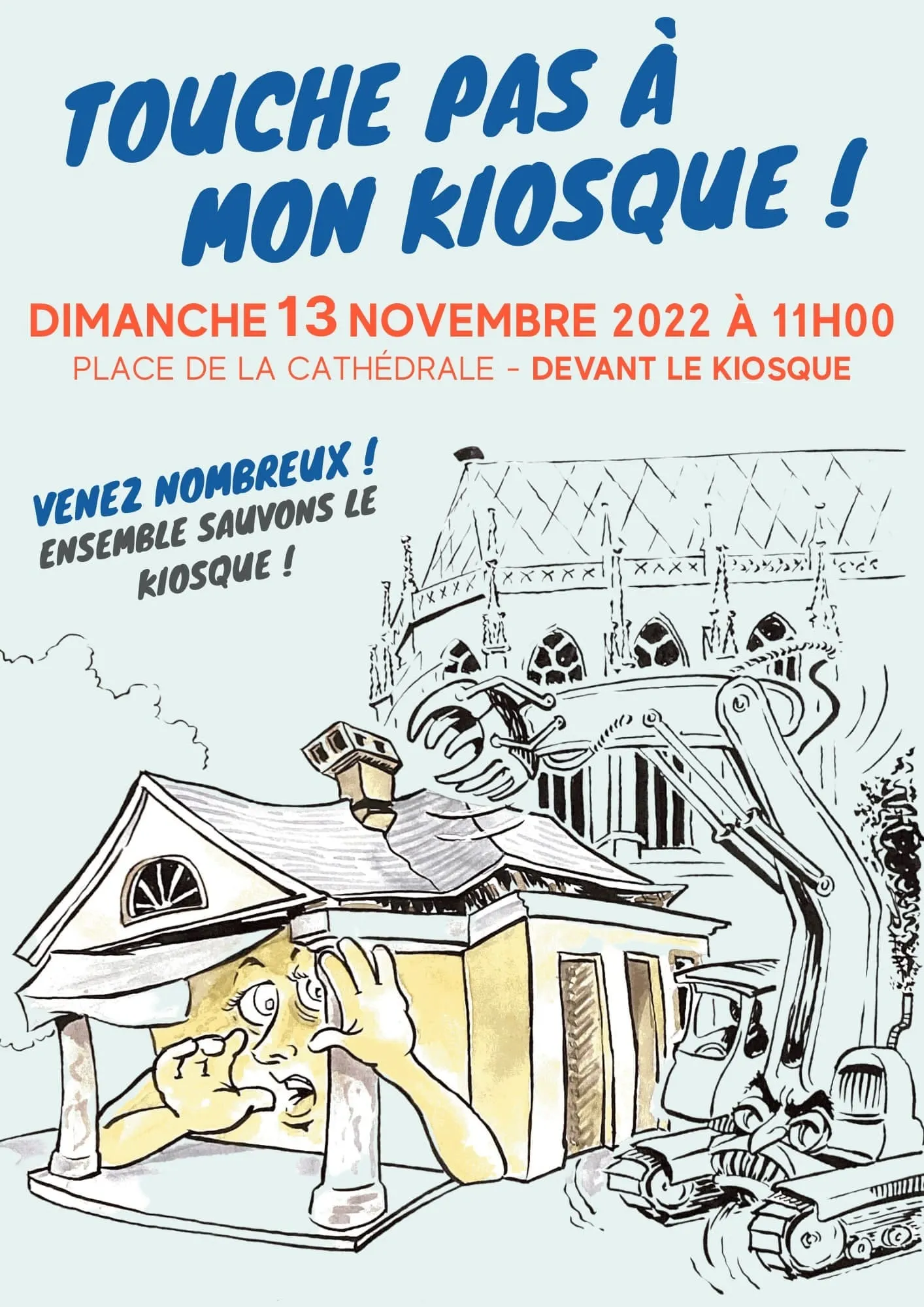 Nous voulons nous rassembler autour du kiosque le dimanche 13 novembre à 11h, pour montrer que beaucoup de personnes tiennent à cet endroit, à ce lieu, à cet objet architectural. Pour donner du poids à notre action, il nous faut être nombreux parce que les décisions ont déjà été prises et on voudrait les faire changer. C’est une question de bon sens aussi d’écouter les habitants d’une ville.