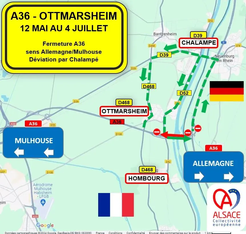 Chaque jour 9 750 usagers circulent sur l’A36, dans le sens Allemagne -> France. Et vous en faites peut-être partie, pour votre travail ou vos loisirs. A compter du lundi 12 mai à 9h et jusqu’au vendredi 4 juillet à 16h il faudra emprunter une déviation. L’A36 sera fermée dans le sens Allemagne vers Mulhouse pendant deux mois. La CeA explique : « Les usagers seront déviés par l'échangeur n° 65 Mülheim à Neuenburg-am-Rhein, puis par Chalampé pour rejoindre Ottmarsheim ou l’A36 direction Mulhouse (RD39, puis RD52 ou RD468). »