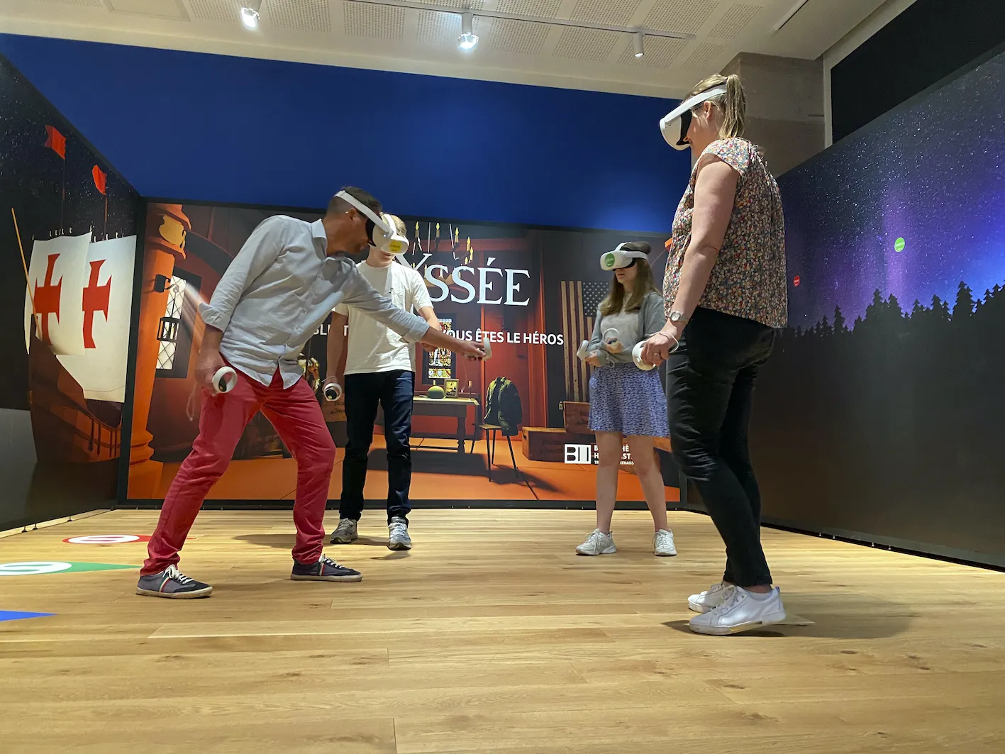 Vous jouerez par équipe de deux à quatre personnes pendant 40 minutes. Sans même bouger d’une pièce de 25 m2 à la Bibliothèque humaniste, vous serez emmenés au château du Haut-Koenigsbourg pendant la Seconde guerre mondiale, dans la ville de Troie assiégée ou encore dans un pays nordique au temps des Vikings avec une magnifique aurore boréale au-dessus de la tête ! Chacune des cinq étapes est construite de la même façon : une médiation historique puis une expérience par le jeu vidéo (vous allez tirer à l’arc, faire avancer des caravelles et même chercher des clés cachées).