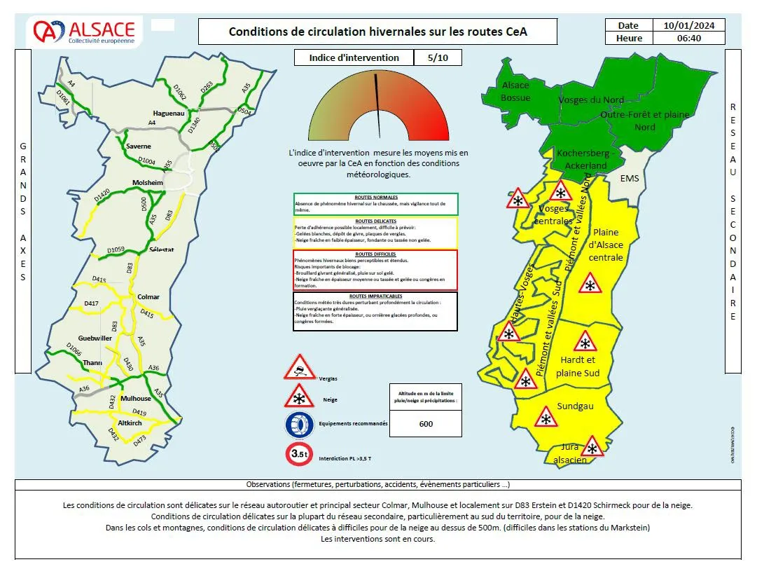 L'épisode neigeux rend la circulation difficile dans tout le Haut-Rhin et le sud du Bas-Rhin. Le réseau autoroutier, les routes secondaires ainsi que les cols et les routes de montagnes sont concernés par ces difficultés. Dès les premières heures du jour, des équipes ont été mobilisées pour le salage des routes. Prudence donc sur les axes routiers.