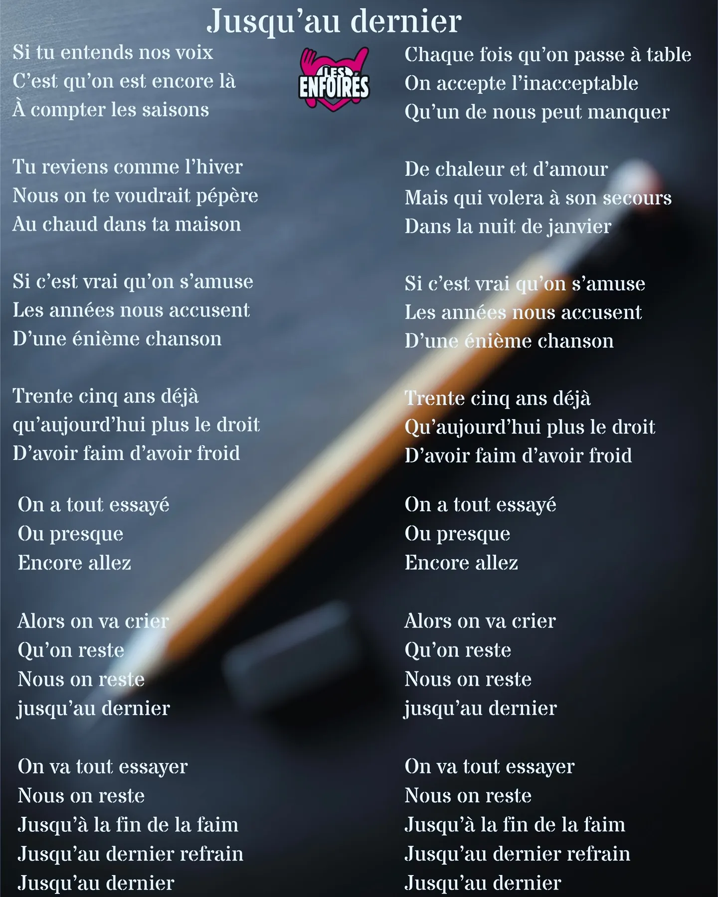 35 ans de tournées des Enfoirés… un anniversaire que les Enfoirés n’auraient jamais dû fêter… mais voilà ils soutiennent depuis toutes ces années les Restos du coeur qui en ont toujours et encore besoin. Et la nouvelle chanson des Enfoirés vient de sortir, à écouter sur Top Music. Intitulée « Jusqu’au dernier », elle a été écrite par Ycare, composée par Ycare et Patrick Bruel et arrangée par Mathieu Mendès.