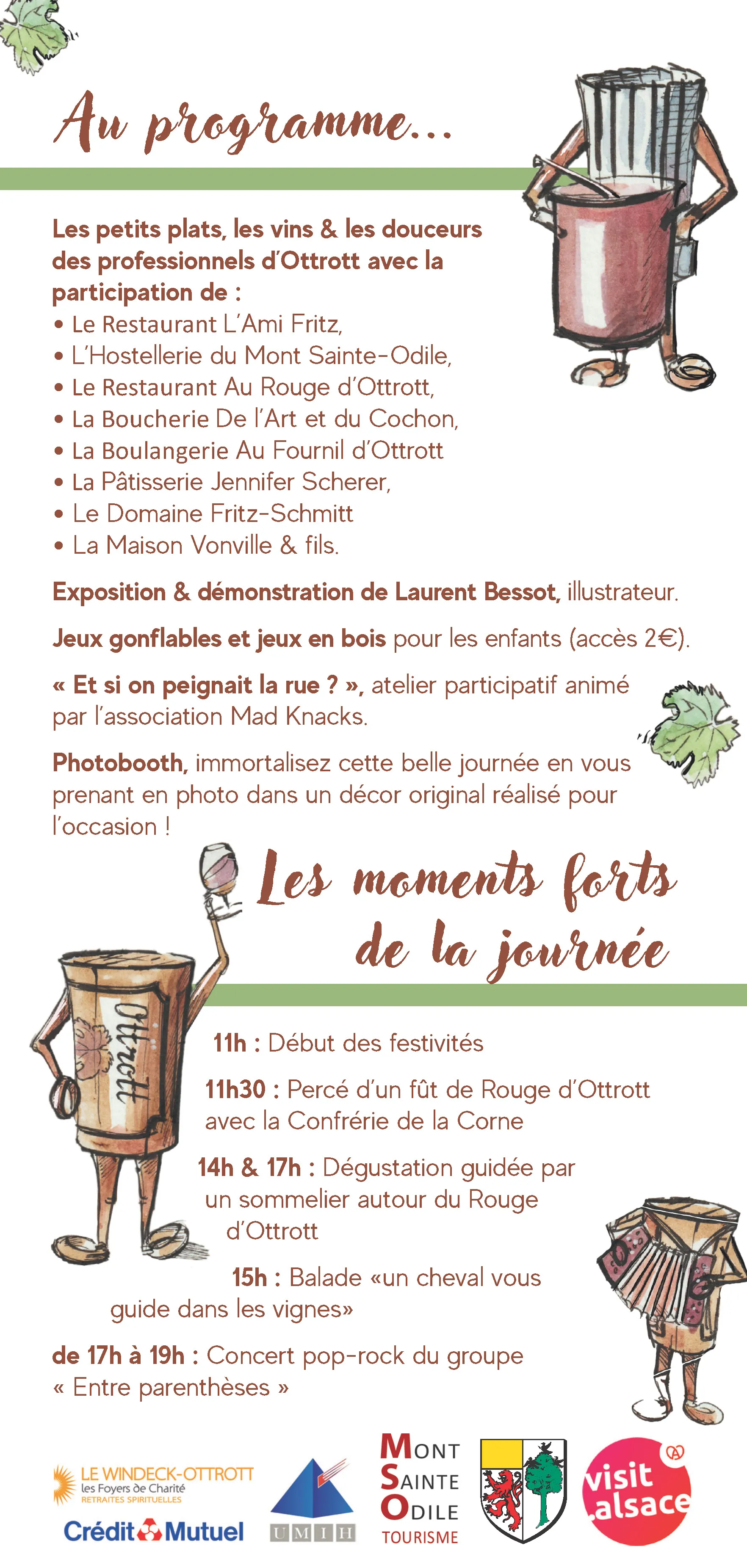 Tout au long de la journée, des spécialités locales et des vins à déguster, dont le célèbre Rouge d’Ottrott, mis en lumière par la Confrérie de la Corne, l’une des 13 confréries viniques d’Alsace !