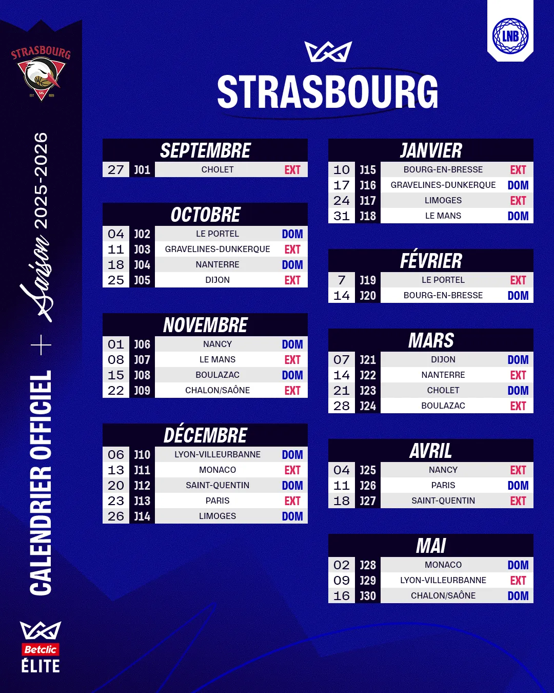 La Ligue Nationale de Basket (LNB) a révélé hier le calendrier de la saison de Betclic Elite 2025/2026. Les supporters alsaciens peuvent déjà se préparer !