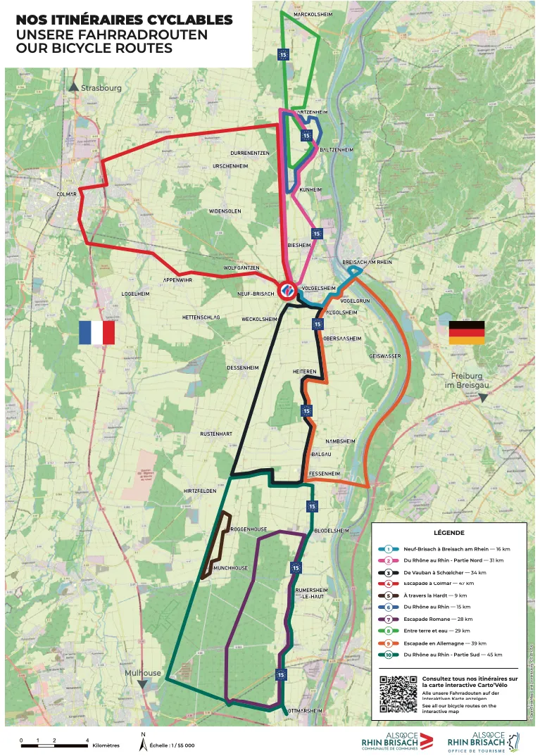 Le premier circuit, qui est accessible à tout le monde, est vers la ville allemande de Breisach-am-Rhein. Ça fait environ 15 km aller-retour, tout par des itinéraires sécurisés. Donc c’est vrai que c’est très plaisant. Et après on a des itinéraires vers le nord ou le sud, sur l’ancien canal, où on peut s’arrêter faire des piques-niques. C’est plat et c’est très convivial pour découvrir le territoire et également aller vers Colmar.