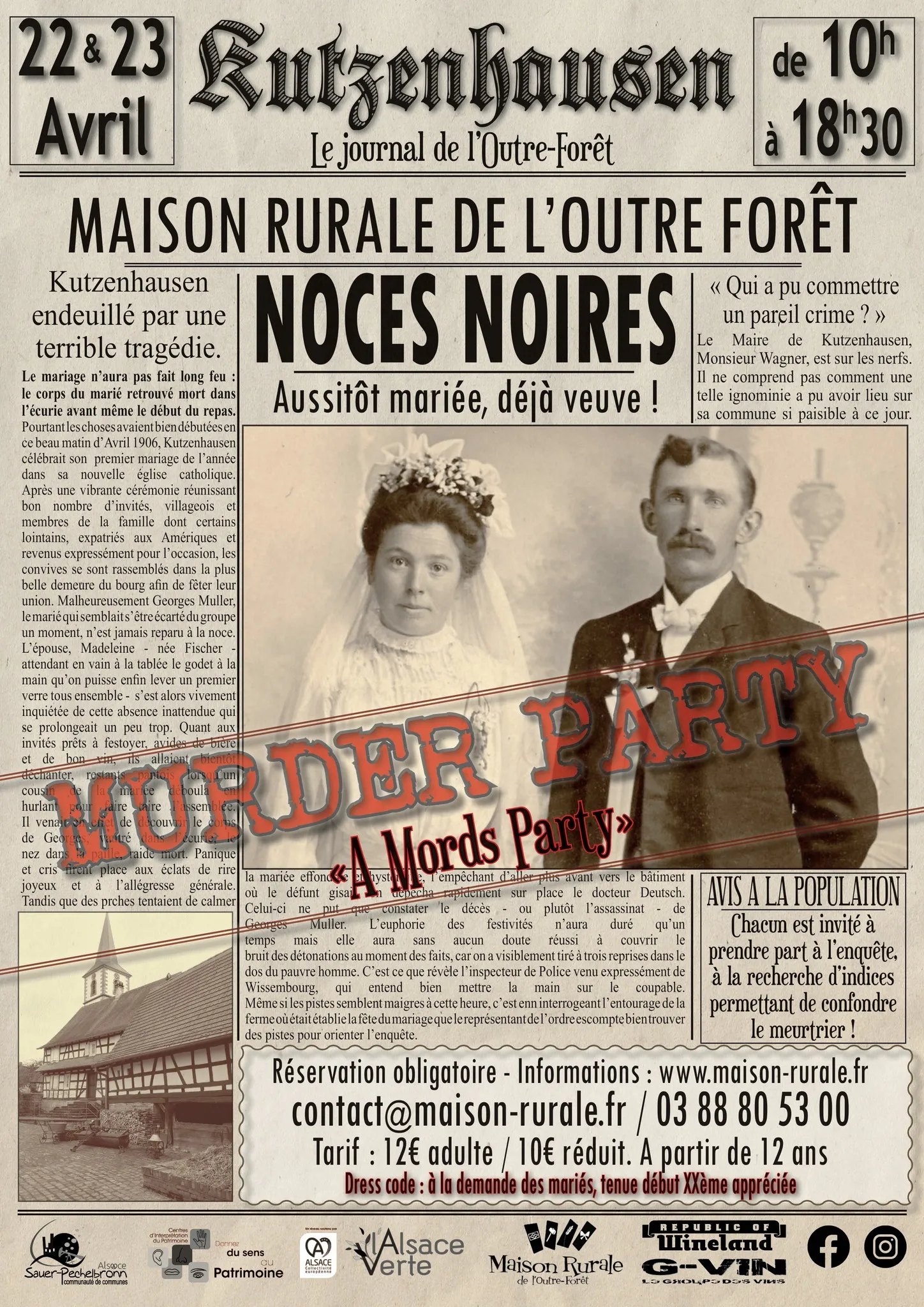 En 1906 à Kutzenhausen, vous êtes invités à un mariage mais il y a eu un meurtre. Les « Noces noires » sont une Murder Party proposées pour la première fois à la Maison rurale de l’Outre-Forêt. Réservez votre place à la table des mariés les 22 et 23 avril (2023 !).