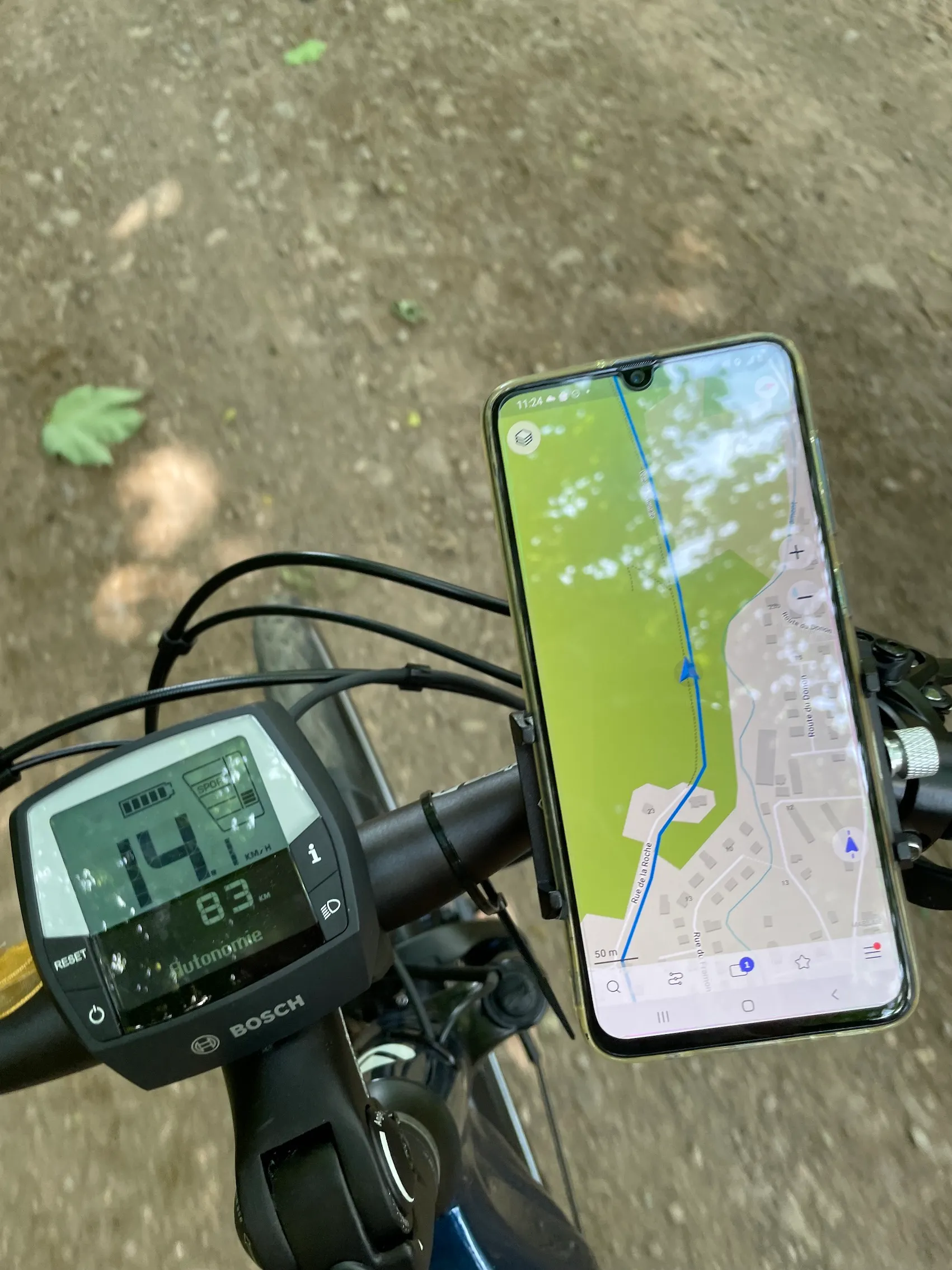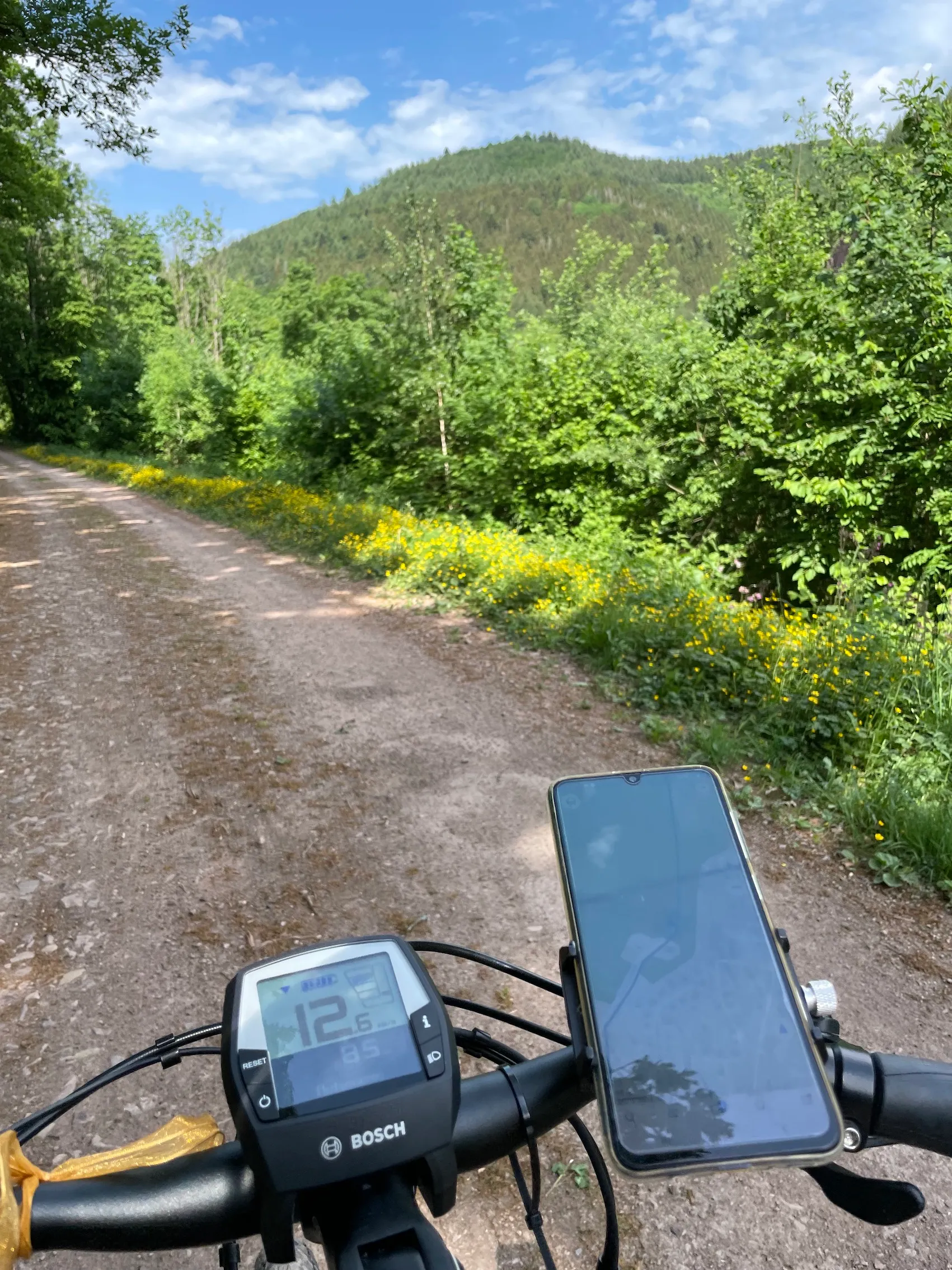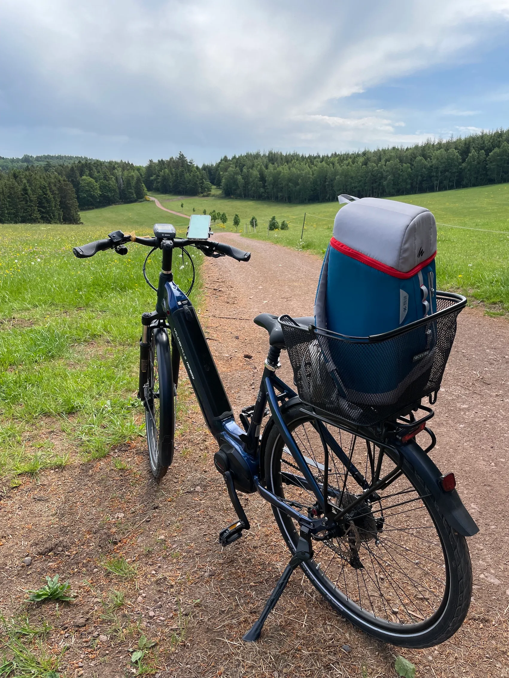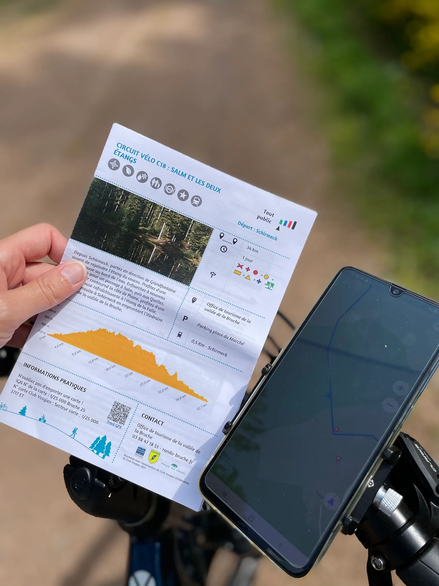 Avec mon vélo à assistance électrique et mon sac isotherme avec mon pique-nique bio, je m’élance donc sur les routes de la Vallée de la Bruche. Et belle nouveauté : l’office de tourisme de Schirmeck met à disposition un smartphone avec GPS pour se repérer très facilement. Il suffit de suivre la flèche bleu (qui indique ma position) et la ligne bleue… et le tour est joué ! J’avoue que cette avancée technologique est très appréciable. Ça m’évitera de m’arrêter à chaque intersection ! Je prends tout de même la version papier du circuit pour lire les explications lors de ma pause déjeuner.
