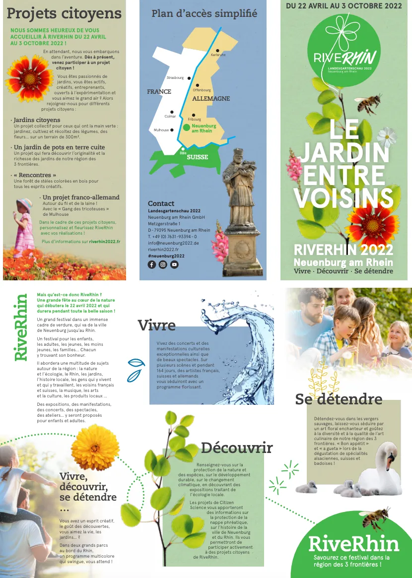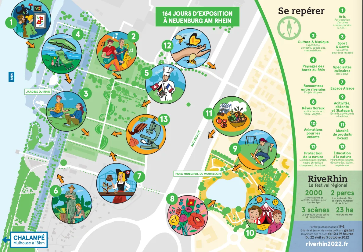 Au bord du Rhin, l'exposition horticole régionale 2022 à Neuenburg-am-Rhein propose plusieurs espaces : le parc Wuhrloch avec ses espaces de jeux pour enfants, l’entre près-vergers et sa mer de fleurs, la terrasse du Rhin où il fait bon se promener ou encore les plaines alluviales avec ses paysages uniques sur le Rhin. Une longue promenade de 665 mètres de long et 35 mètres de large permet d’accéder aux différents espaces. Des tonnelles ou des hamacs invitent à la détente et le Rhin nous donnerait presque la sensation d’être en vacances aux 750 000 visiteurs attendus.