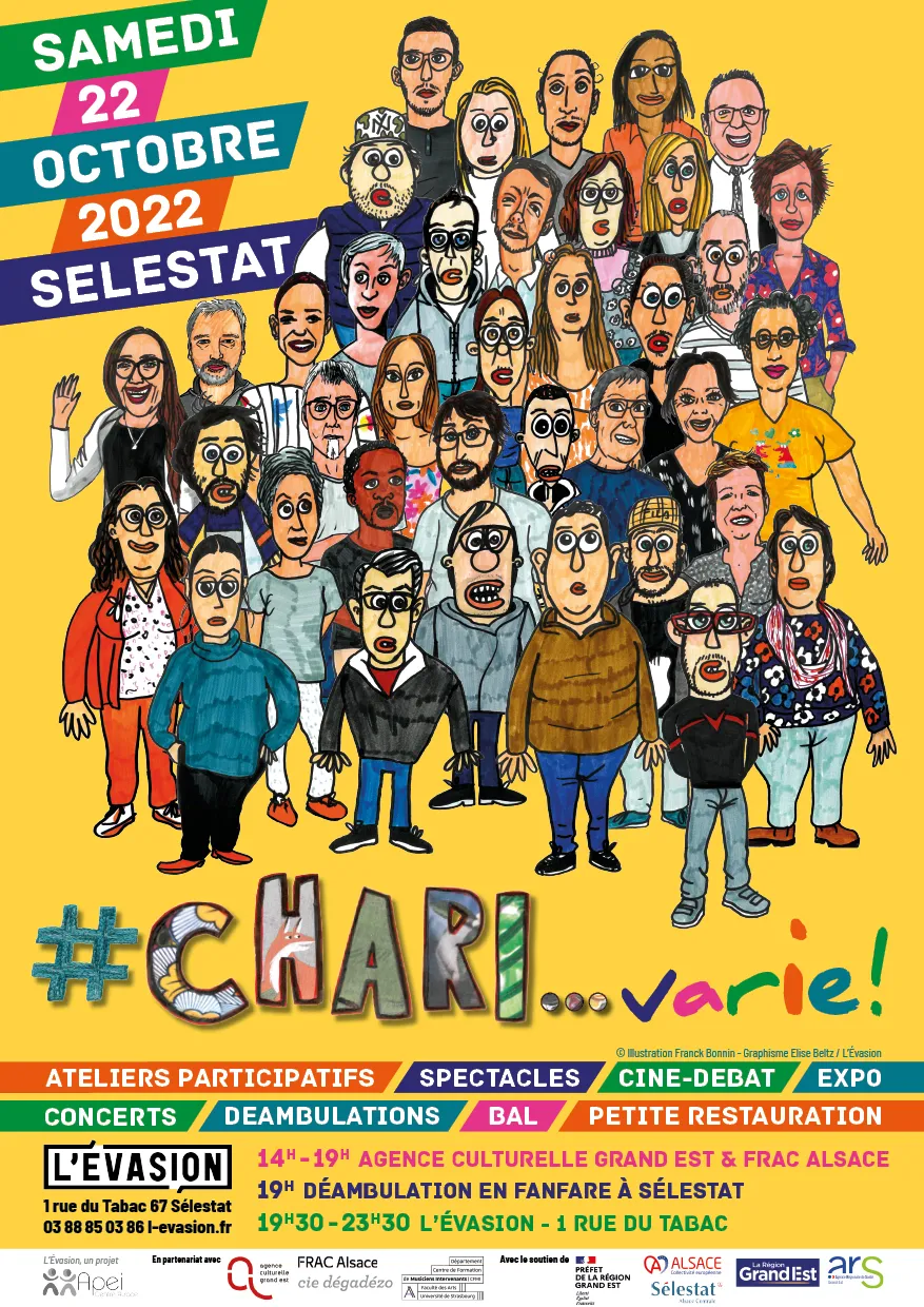 Le samedi 22 octobre se déclinera en trois temps forts : de 14h à 19h à l’Agence Culturelle Grand Est avec des spectacles et des animations, à 19h une déambulation festive et culturelle permettra de quitter l’Agence Culturelle en direction de l’Evasion puis dès 19h30 soirée guinguette et concerts à l’Evasion, rue du tabac à Sélestat. « Toutes les demi-heures il y aura une nouvelle proposition artistique », promet Florence Mulot. Cette journée est à destination de toute la famille. Et « Chari…varie » variera sans doute encore en 2024 pour fêter les 20 ans de l’Evasion de Sélestat.