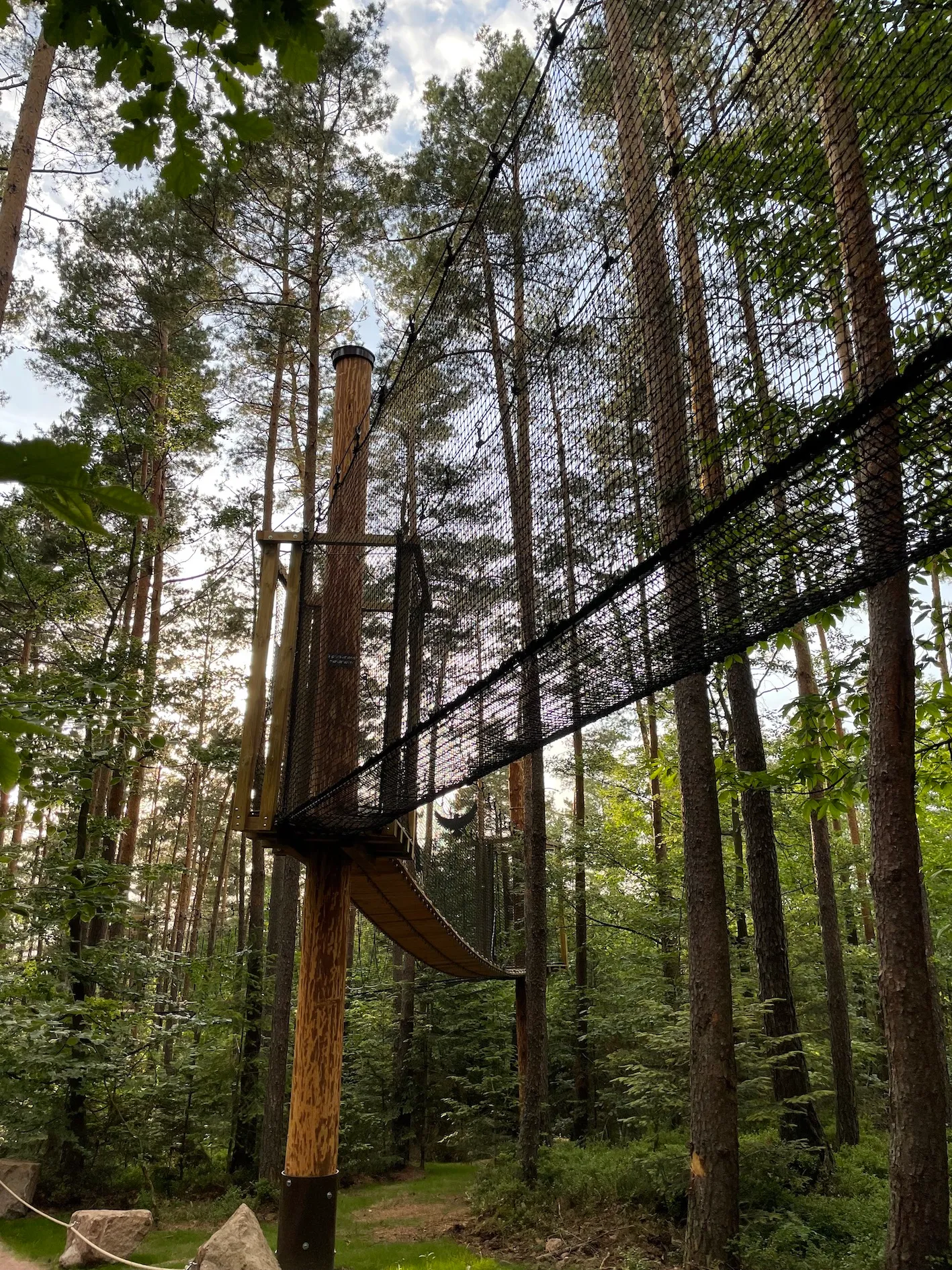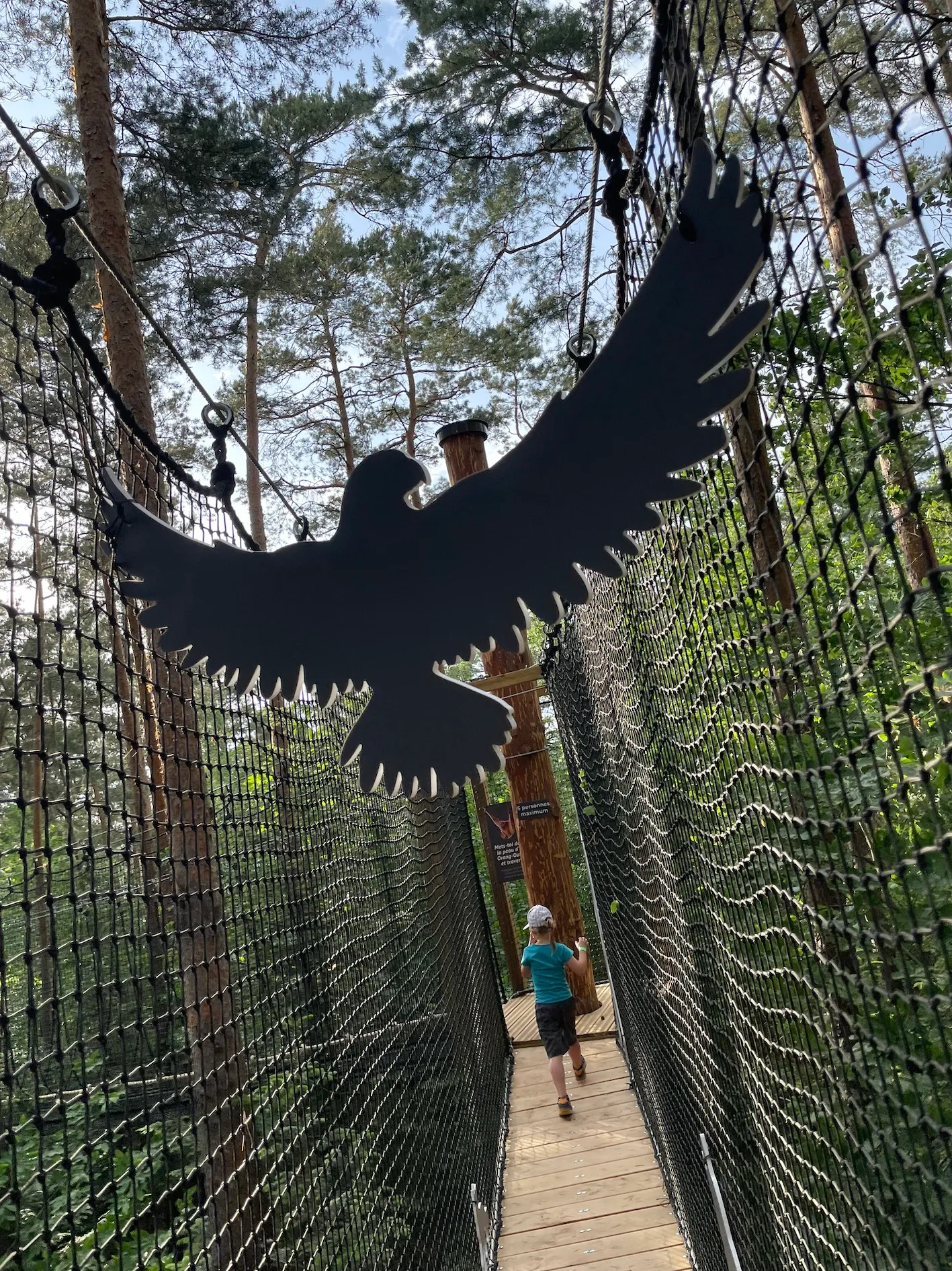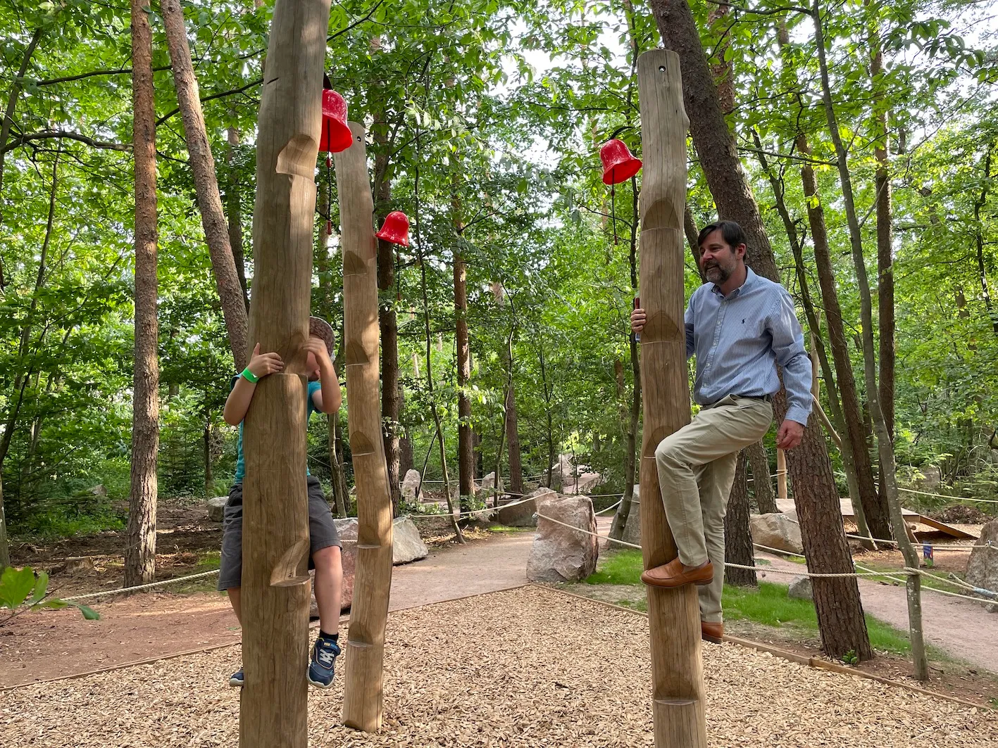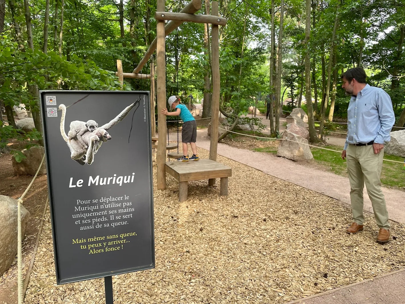 On a créé un nouvel espace qu’on appelle « Dans la peau d’un singe » et qui est extrêmement complémentaire avec la visite de nos magots, de nos macaques de Barbarie dans le parc. Là c’est vraiment - à la sortie - vous avez des agrès au sol et en hauteur : c’est de se plonger dans le monde des primates. Marcher comme un sifaka, se déplacer comme un gibbon, se déplacer comme un orang-outan. On a vraiment mis un espace dans la nature, dans cette très belle forêt, où on en apprend un peu plus sur les primates, sur la locomotion, sur leur mode de vie (par exemple ce que va manger le tarsier). Tout ça vous le découvrez au grès des structures qu’on a mis en place et qui permettent de complémenter la visite. Après avoir vu les singes, on a envie de faire comme les singes ! C’est pour tout public. Et c’est vrai que d’être dans la structure en hauteur, au milieu de ces arbres-là, c’est vraiment très très beau. Il y a un côté magique, relaxant et on a l’impression d’être dans un autre monde. Déjà on était dans un autre monde avec nos singes en liberté. Et là on va encore dans un autre monde, dans cette belle forêt vosgienne où on apprend des choses en s’amusant et ça complémente très très bien la visite. Ça fait partie aussi d’une demande de découvrir la nature, les gens sont plus réceptifs. Et ça permet vraiment d’avoir un site où l’on peut passer deux bonnes heures en famille, en extérieur, profiter de notre restauration, d’une belle terrasse en extérieur où l’on peut prendre son pique-nique si l’on veut. A la fin tout le monde est content : les adultes et les petits sont contents !