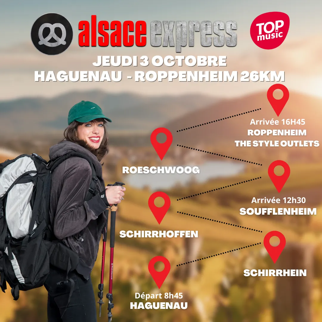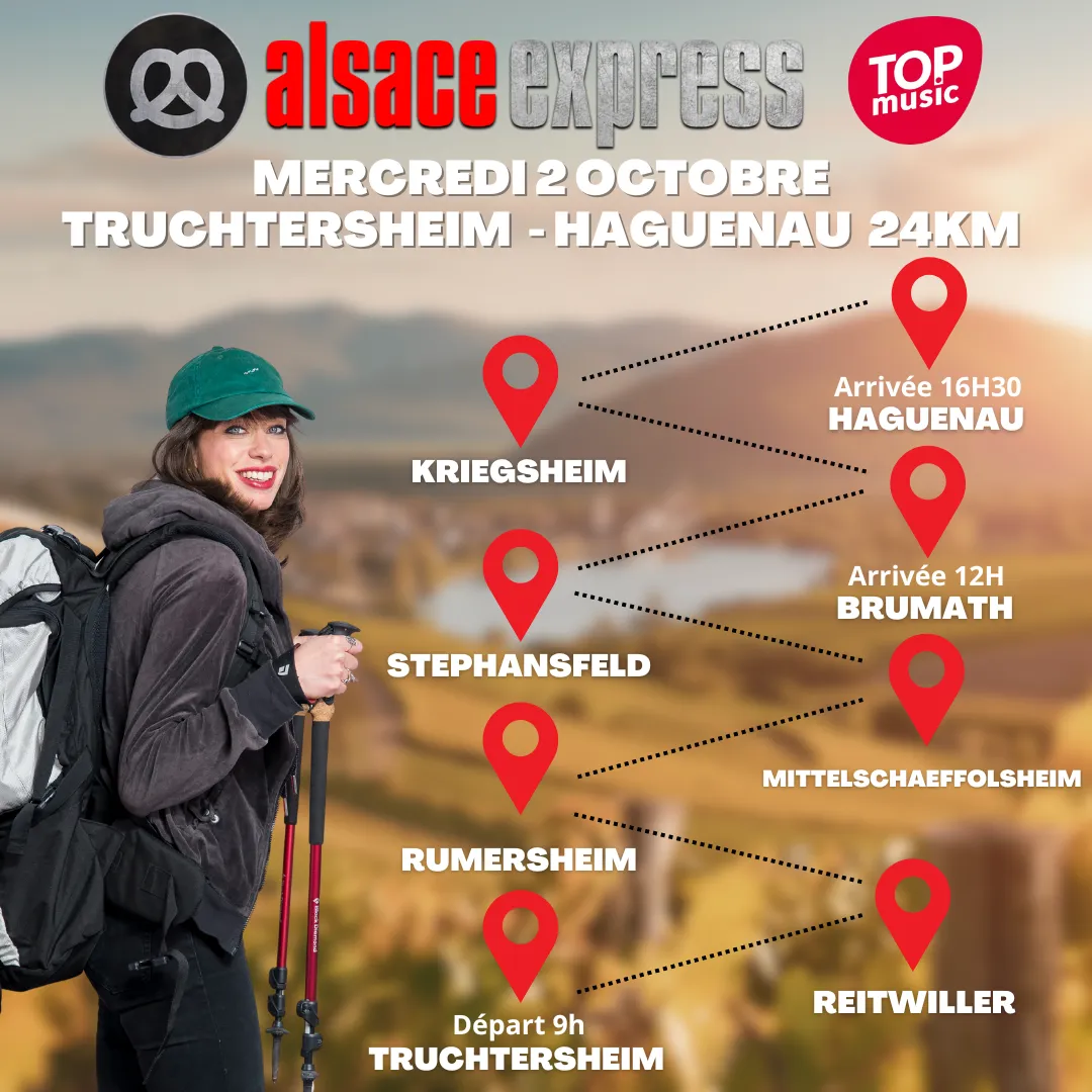 Découvrez le parcours détaillé d'Estelle pour son challenge Alsace Express ! Rejoignez également le groupe Whatsapp pour être informé en temps réel de sa position et de toutes les informations pendant sa marche.