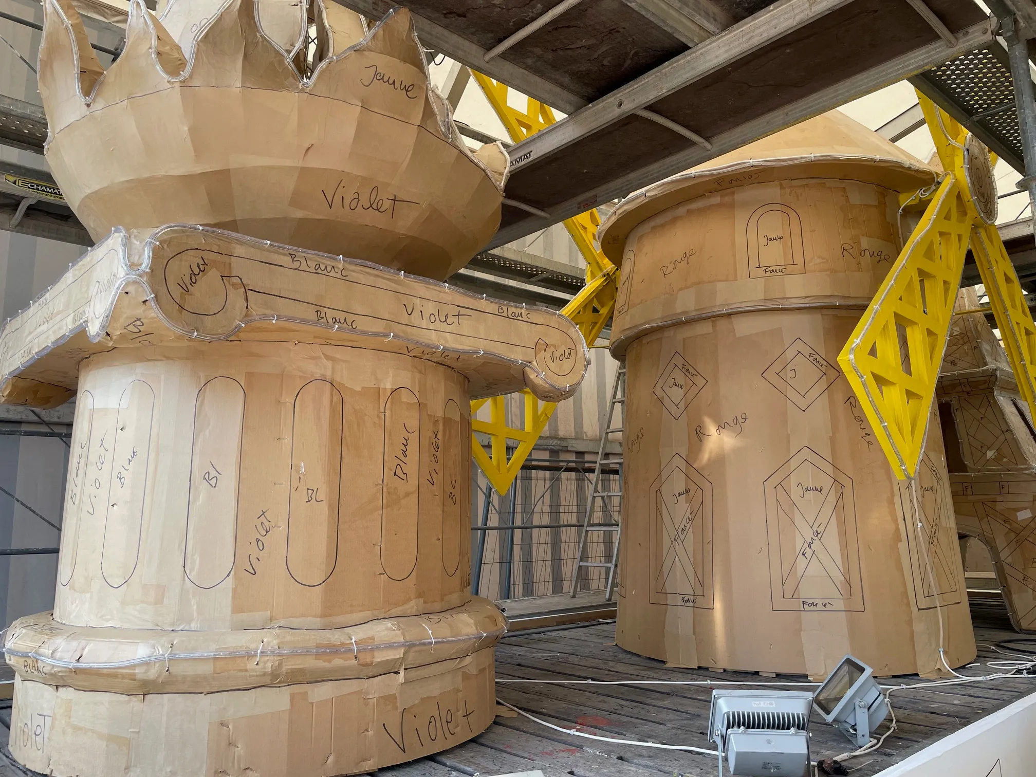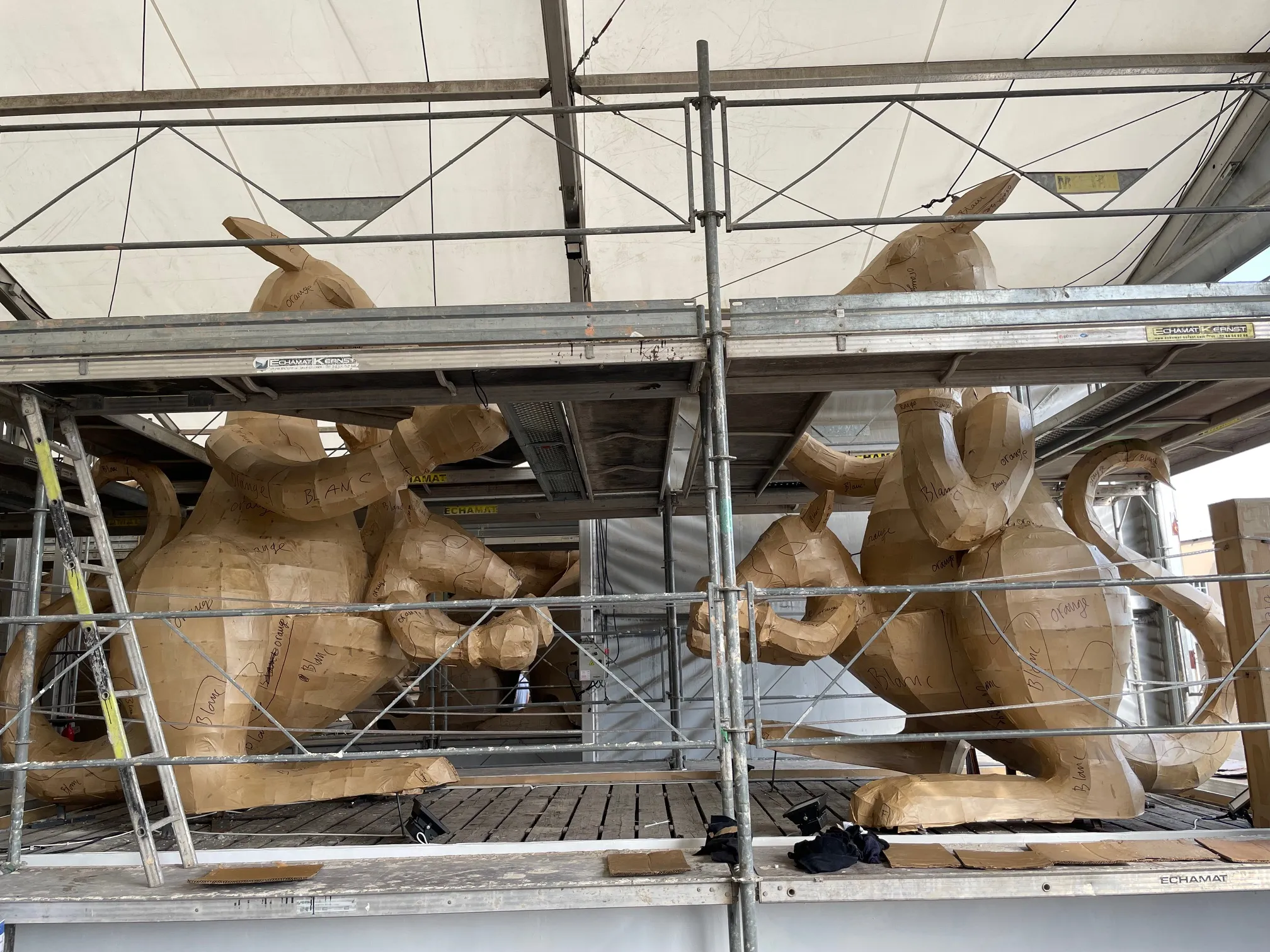 Dans les ateliers municipaux de Sélestat, les chars sont encore vierges de fleurs. Les dahlias arriveront vendredi matin / @Top Music - CR