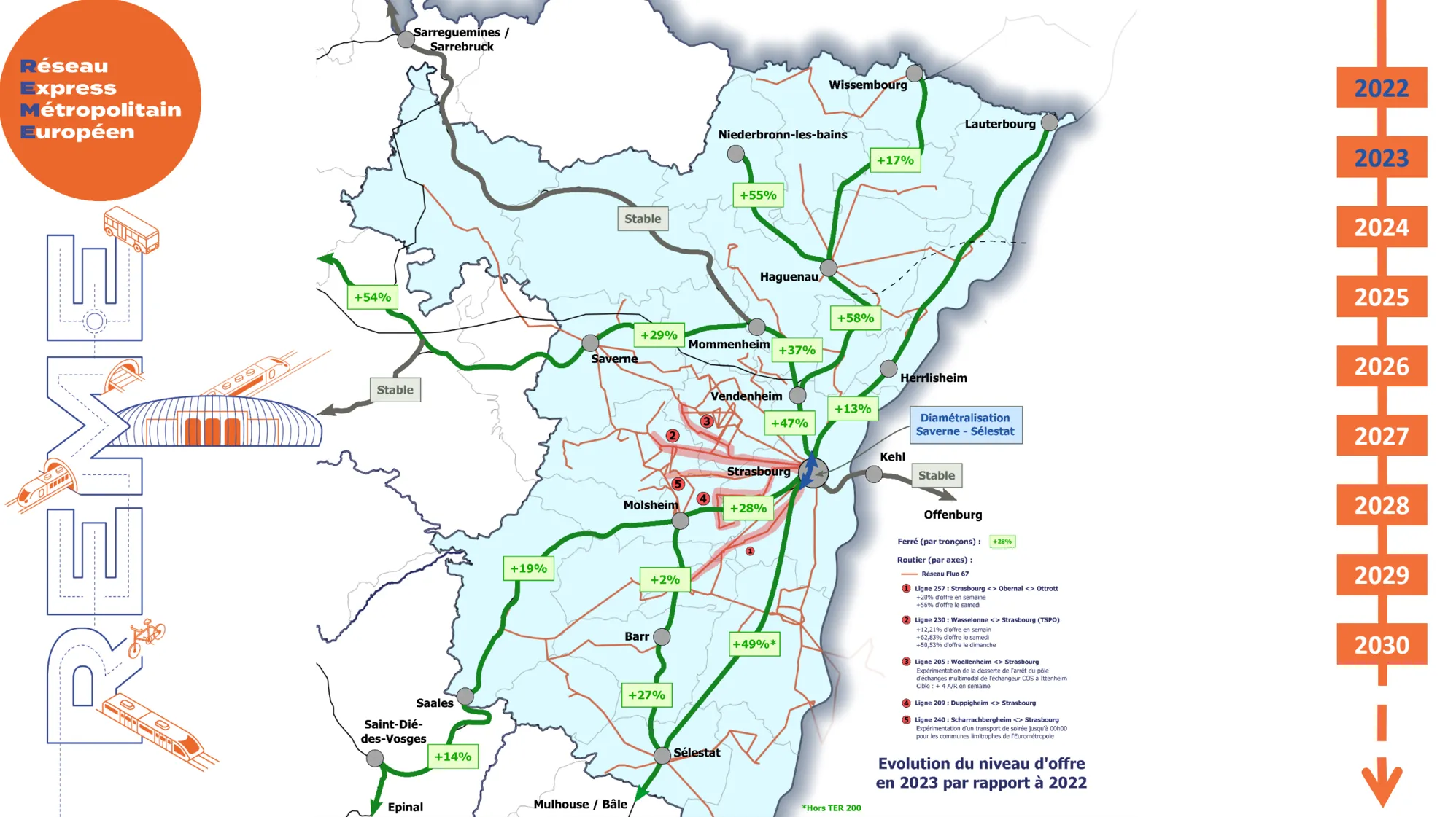 Le REME nécessitera un budget de fonctionnement de 14 millions d’euros par an. Si le ferroviaire est l’épine dorsale de cette offre, les autres modes de transports ne sont pas oubliés : les cars express seront renforcés, les gares deviendront des pôles multimodaux. Et pour que le REME soit un peu plus qu’un rêve pour les Alsaciens, des investissements seront réalisés dans les années à venir notamment sur les lignes au nord de Strasbourg, vers Wissembourg et Lauterbourg : 600 millions d’euros seront investis.