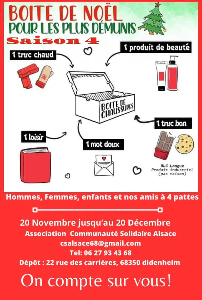Pendant la période Covid, une jolie action de solidarité est née : offrir des boites de Noël aux plus démunis, enfants ou adultes. Une petite attention qui a donné le sourire à des milliers de personnes. L’opération des boites de Noël revient cette année encore. La collecte débutera le 20 novembre dans plusieurs points de collecte en Alsace. Le principe est toujours le même : prenez une boite (par exemple une boite à chaussures) et glissez-y plusieurs cadeaux, quelque chose qui se mange (des bredele ?), quelque chose qui réchauffe (une jolie écharpe ?), quelque chose qui fait plaisir (une crème, un gel douche ?) et quelque chose qui permet de sortir du quotidien (un livre, un jeu ?). Rajoutez un petit mot et votre boite de Noël est prête. Pour que la distribution se fasse au mieux, indiquez s’il s’agit d’une boite pour une femme, un homme ou un enfant (fille ou garçon). Et nouveauté cette année, vous pourrez aussi préparer des boites de Noël pour nos amis à quatre pattes !