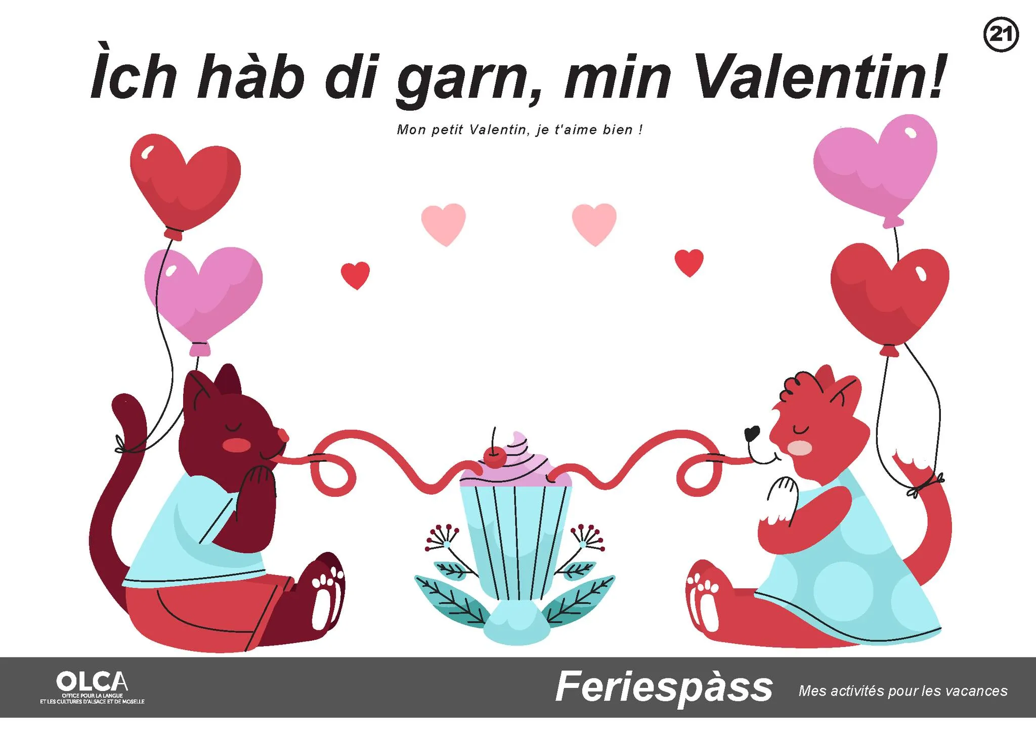 L’OLCA (l’office pour la langue et les cultures d’Alsace) propose un cahier d’activités sur le thème de la Saint-Valentin avec des recettes, des bricolages, des dessins et des coloriages. Le tout en alsacien !