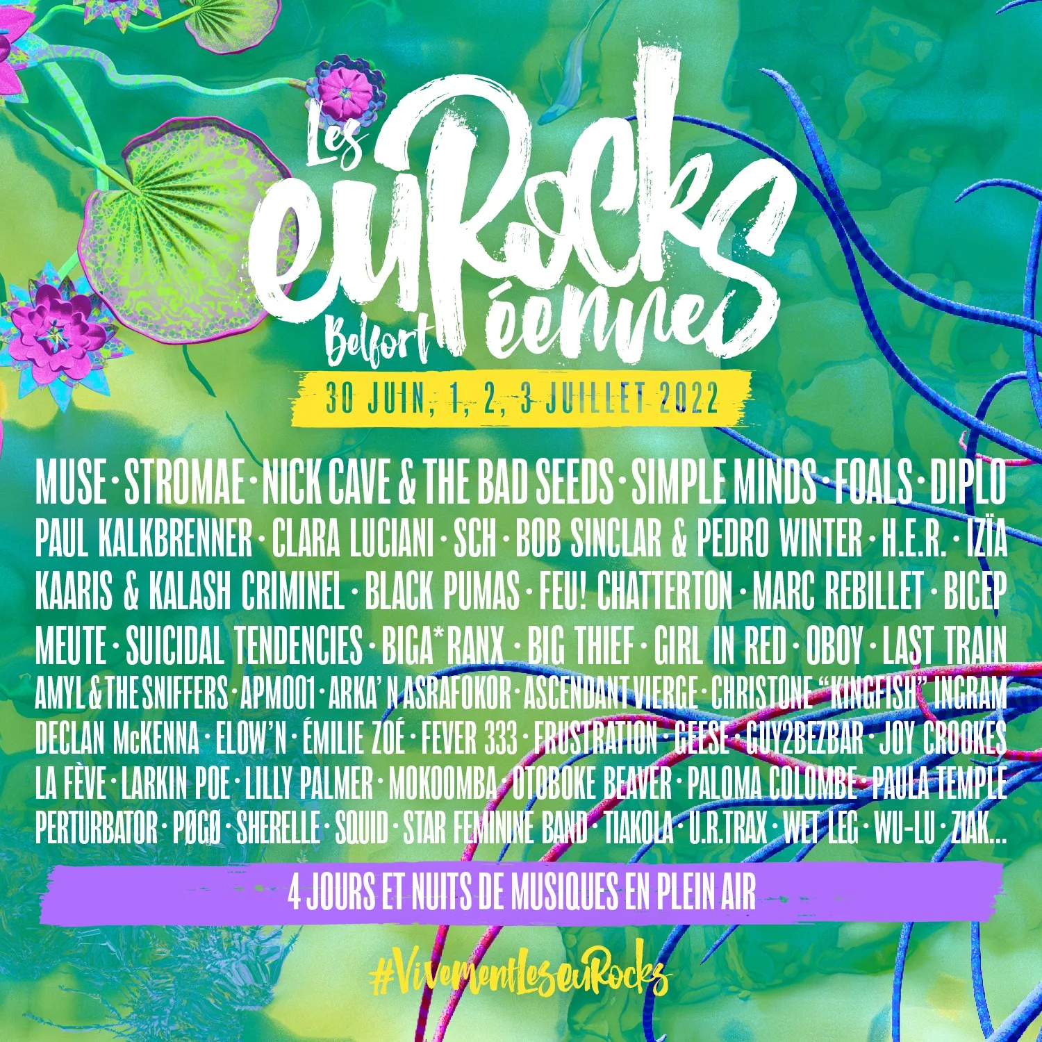 Muse, Stromae, Clara Luciani, Simple Minds, Last Train… Autant d’artistes qui se succèderont pendant quatre jours sur les différentes scènes des Eurockéennes de Belfort. « En 2022, plus de 80% des artistes se produiront aux Eurockéennes pour la première fois (…) La fête est de retour », expliquent les organisateurs des Eurocks qui ont dû faire face à deux années sans grand festival en raison de la crise sanitaire. A noter que cette année encore, le camping sera gratuit (accès aux détenteurs d’un billet Eurocks).