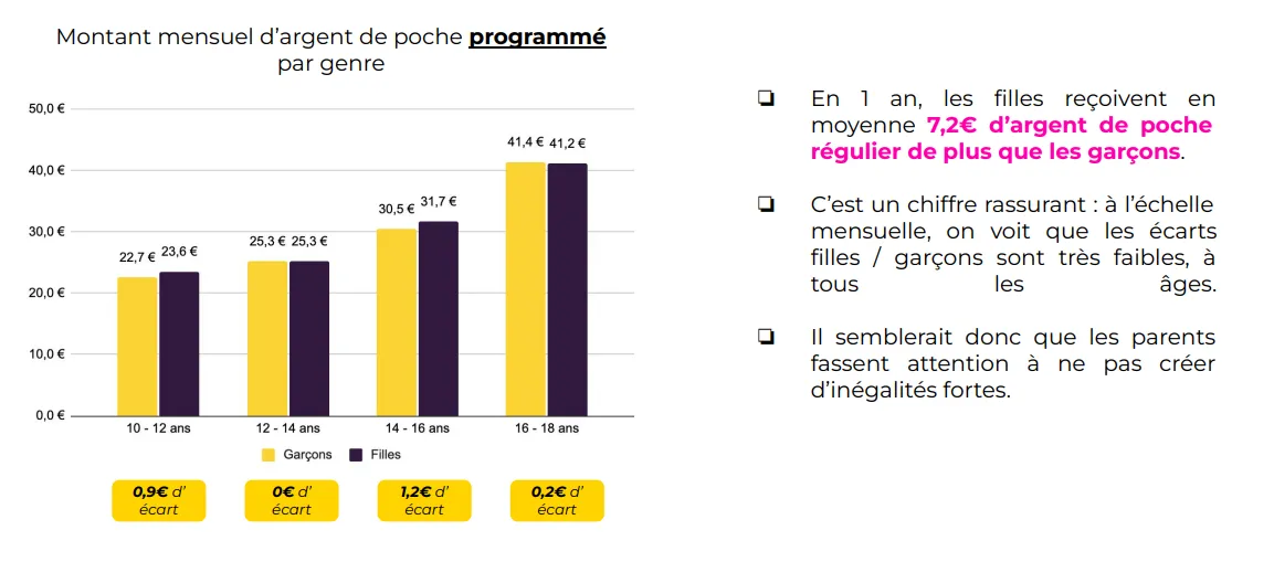 Selon l’étude, il semblerait que la différence se crée au moment des “rallonges”. Si les filles demandent plus souvent de l’argent à leurs parents (en plus de l’argent de poche régulier), le montant souhaité est moins élevé que celui des garçons (29,1€ vs 27,8€ pour les filles). S’ajoute à ça, le fait que les demandes des garçons sont plus souvent acceptées par les parents que celles des filles.