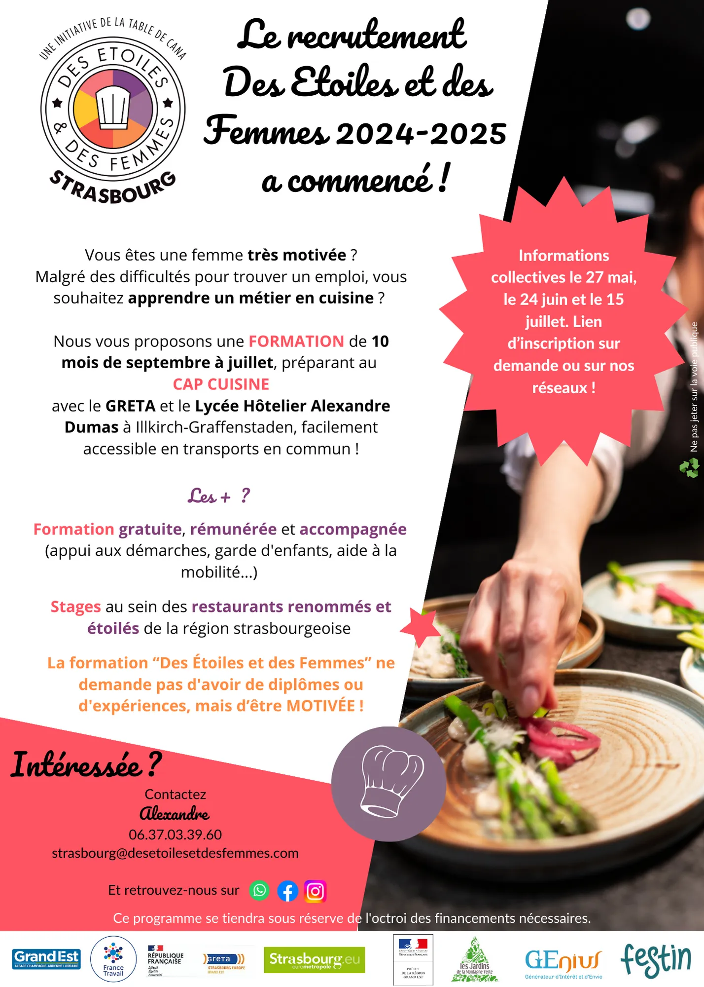 L'objectif de l'opération "Des étoiles et des femmes" est de former 12 femmes à un CAP cuisine en alternance dans des restaurants étoilés ou gastronomiques de l'agglo strasbourgeoise. Parmi ces restaurants, on retrouve notamment Terroir & Co (Sofitel Grande Île), le Blue Flamingo, Saveurs et Saisons, Le Pont Tournant, La Cocotte, Les Innocents, la Brasserie Boëhm, l’ID, le Pacific Princess ou le Muensterstuewel.