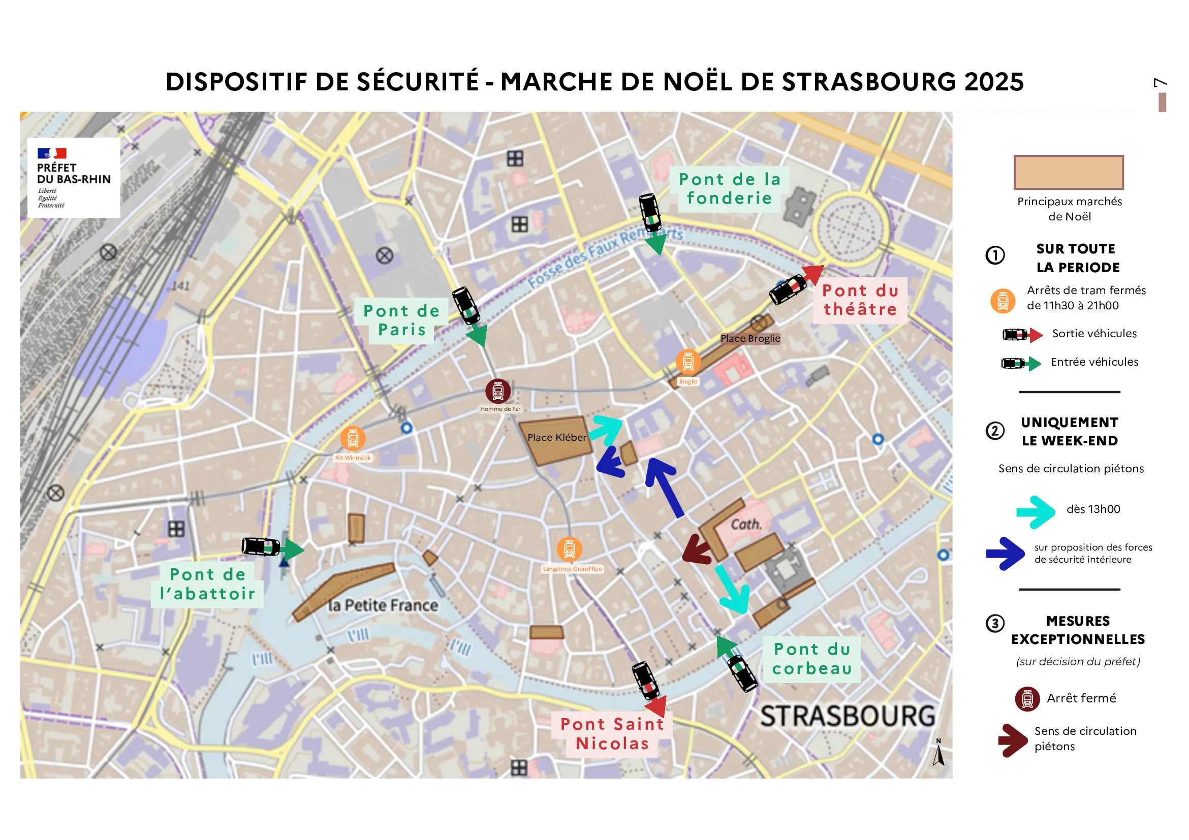 Avec plus de 3,4 millions de visiteurs en 2024, la gestion des flux représente un véritable défi pour assurer la sécurité de tous. Plusieurs mesures vont être mises en place à l’ouverture du marché de Noël. Les arrêts de tram qui se trouvent à l’intérieur de la Grande Île (''Broglie'', ''Alt Winmärik'' et ''Langstross Grand Rue''), à l’exception de la station ''Homme de fer'', ne seront pas desservis. Le dispositif prévoit également un renforcement des moyens des forces de la caserne de pompiers de Finkwiller qui seront déployés sur plusieurs points stratégiques. Enfin, l'accès à la cathédrale de Strasbourg sera modifié pendant toute la période. L’entrée de l’édifice se fera place du château, côté sud.