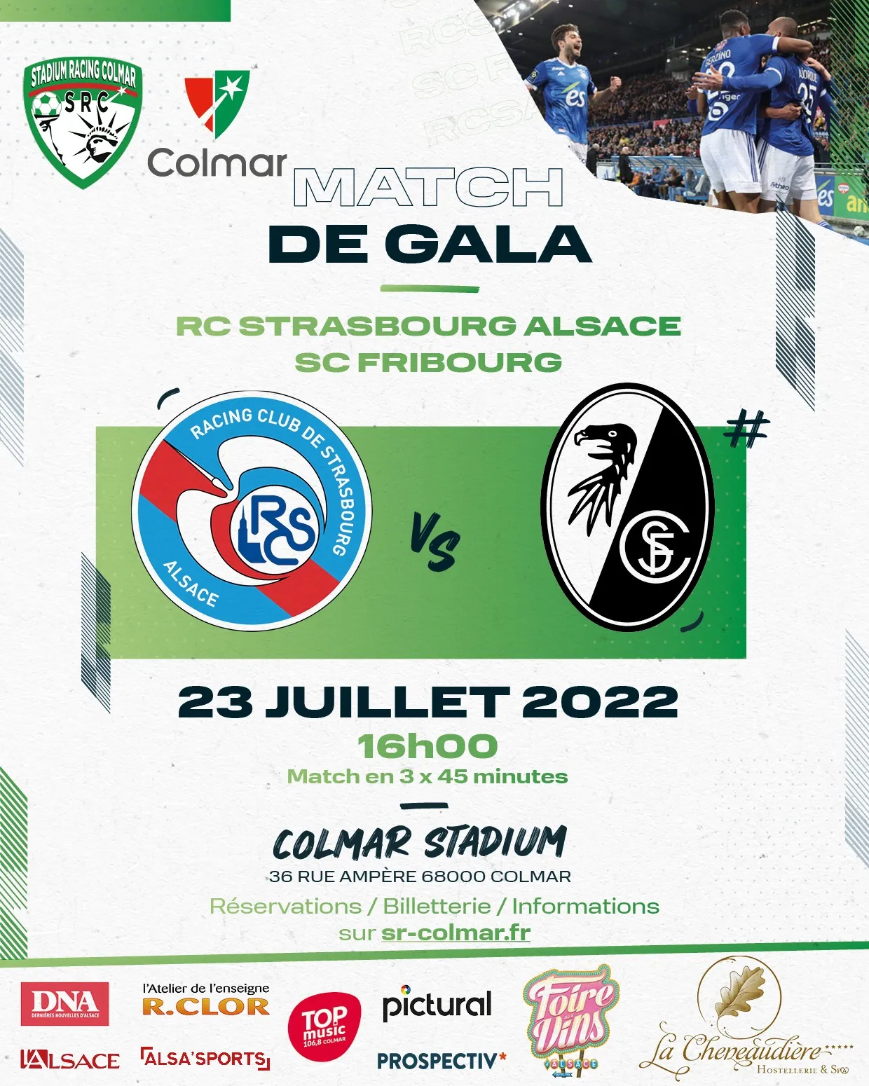 Vous serez tous en vert le samedi 23 juillet au Colmar Stadium… même si les joueurs colmariens ne seront pas sur le terrain, mais bel et bien là entrain d’encourager leur club partenaire - le Racing Club de Strasbourg - face au SC Fribourg. Ce match de gala permettra de voir tourner l’ensemble des équipes qui joueront 3 x 45 minutes. A noter cette info spéciale : chaque billet du match vous permettra d'accéder gratuitement à la Foire aux Vins d'Alsace de Colmar uniquement le dimanche 24 juillet et sur présentation de ce dernier.